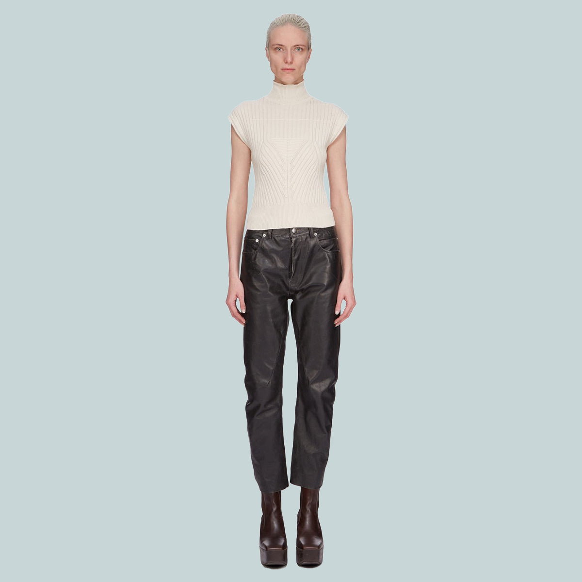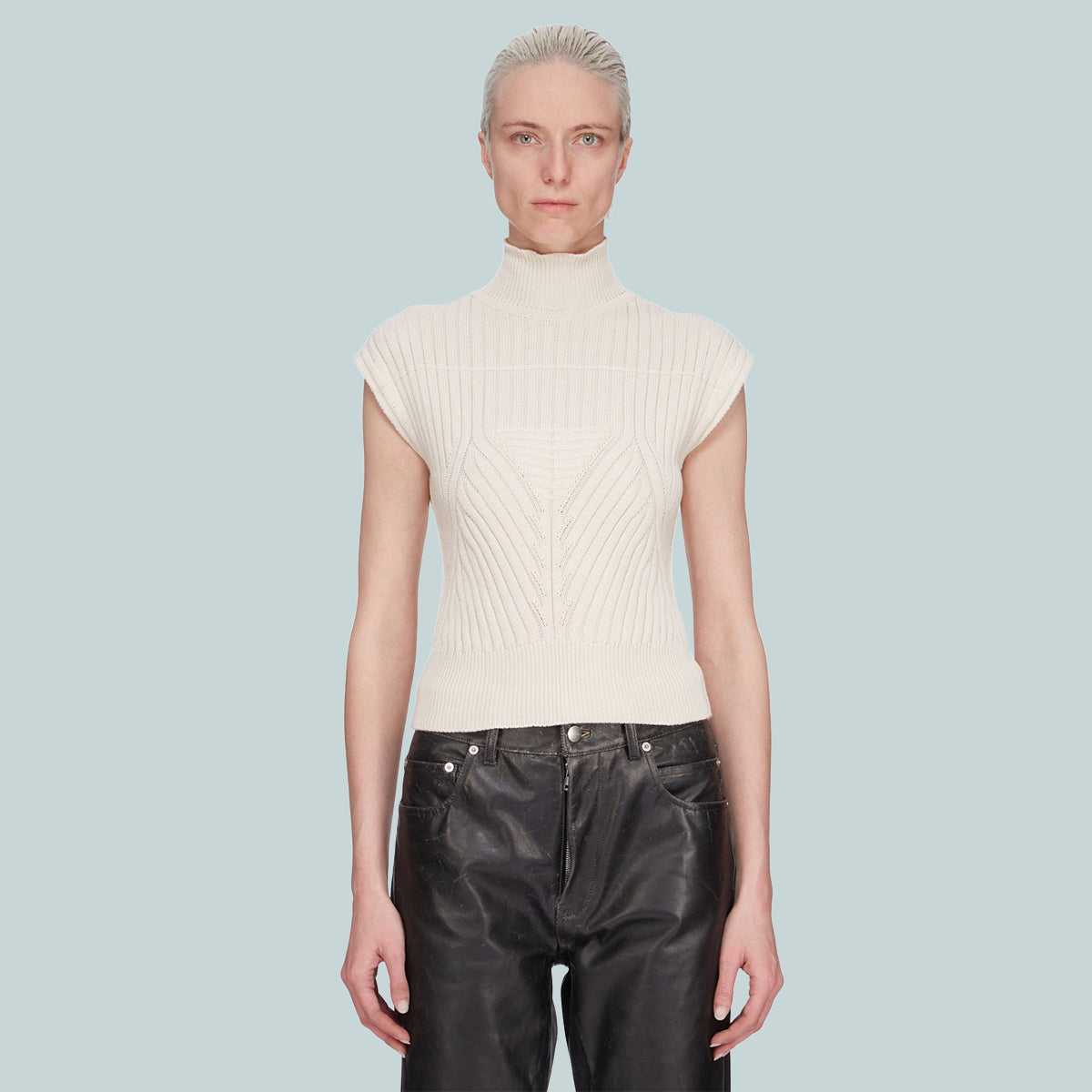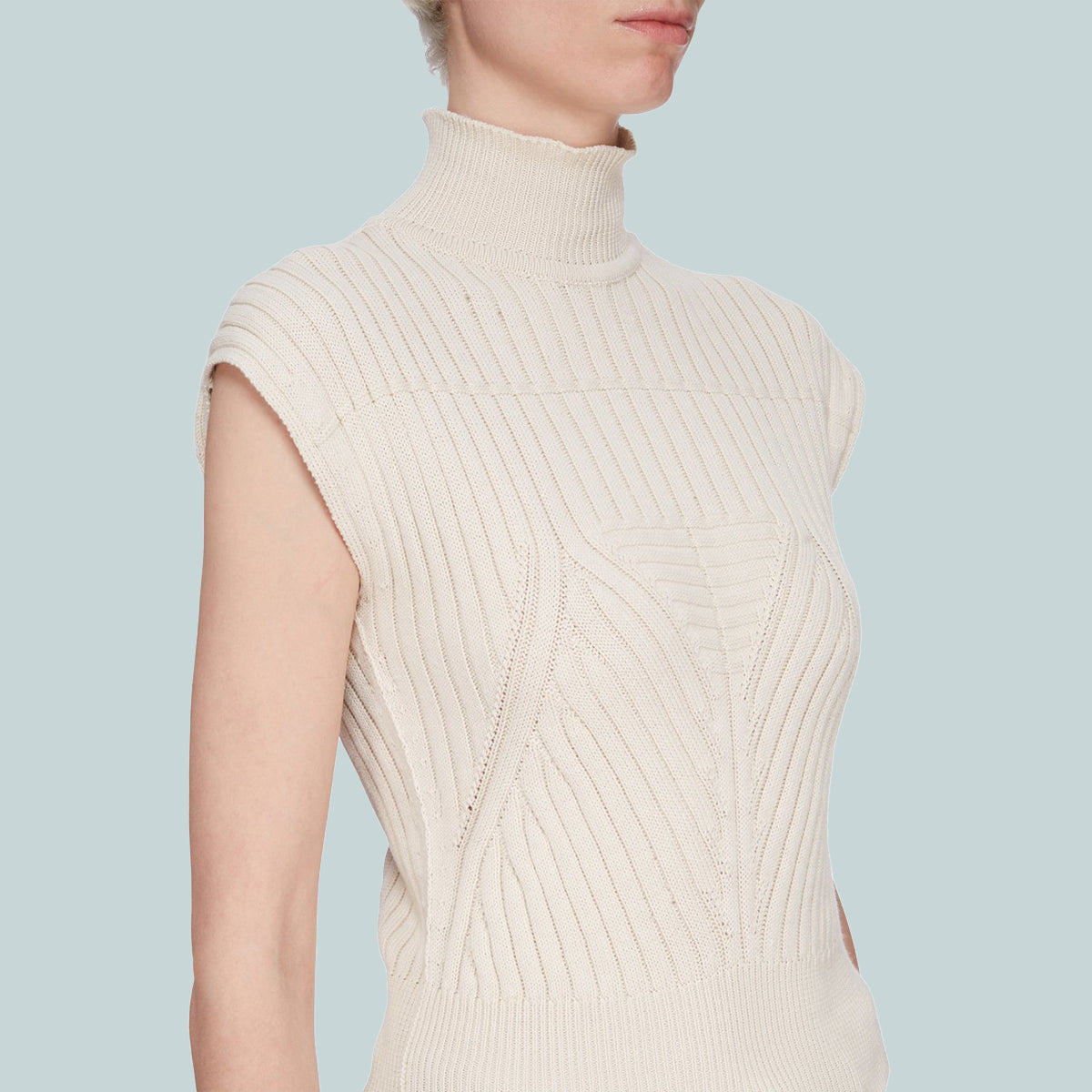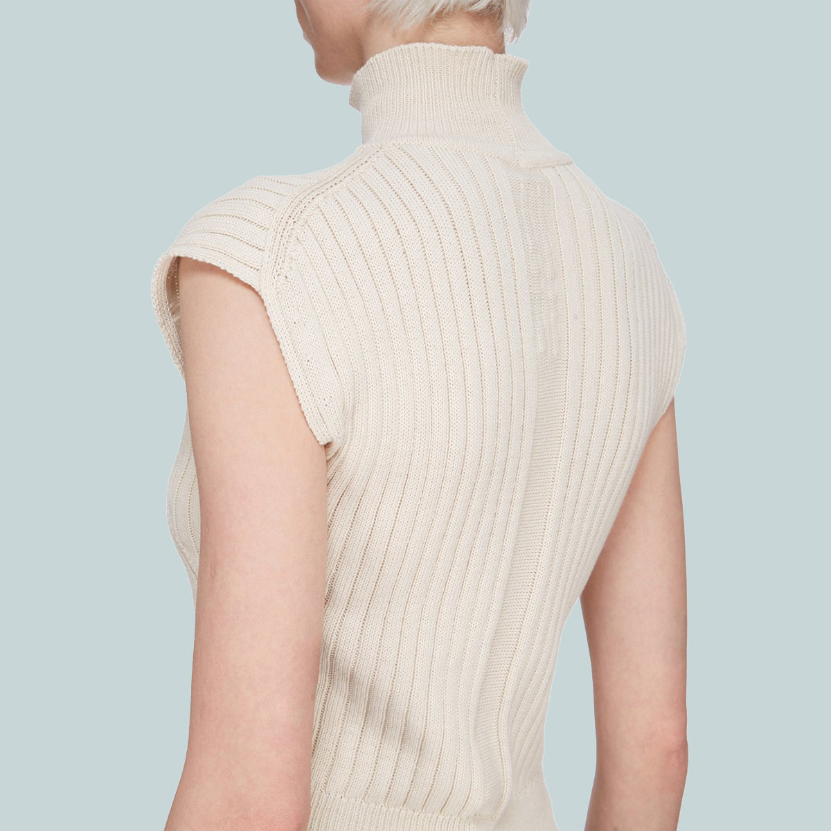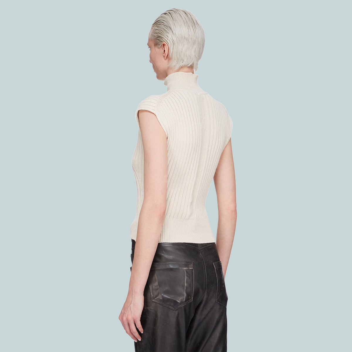 this sl turtle is above-hip length, it has wide shoulders and is sleeveless. it has a turtle neck and wide waistband in slim ribbing. it features a megarib knit design, with a wide vertical rib the back and front body, and diagonal lines running downwards into the center front. it has a vertical rib back with the signature knit channel running down the center back spine.