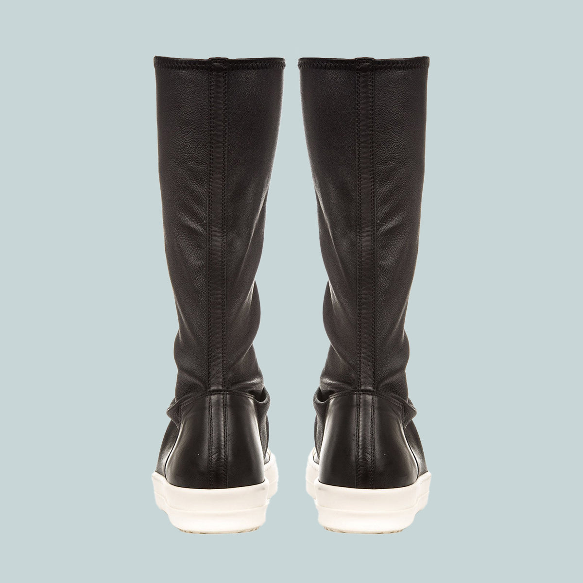Rick Owens socks sneakers in black stretch lamb leather feature folds and drapes around the ankle, stitching details along and around the leg, a leather panel on the back of the heel, toe caps and shark-tooth soles.