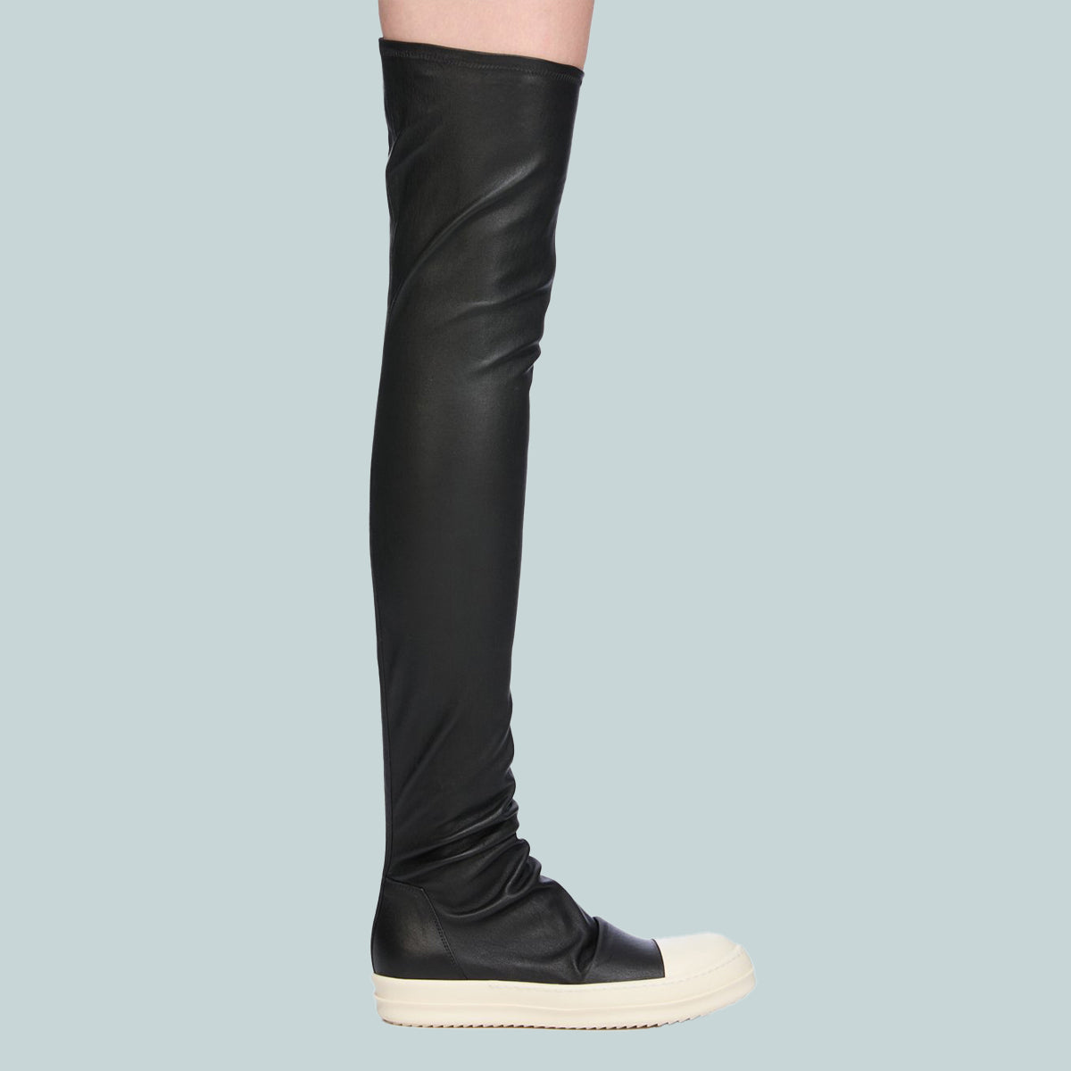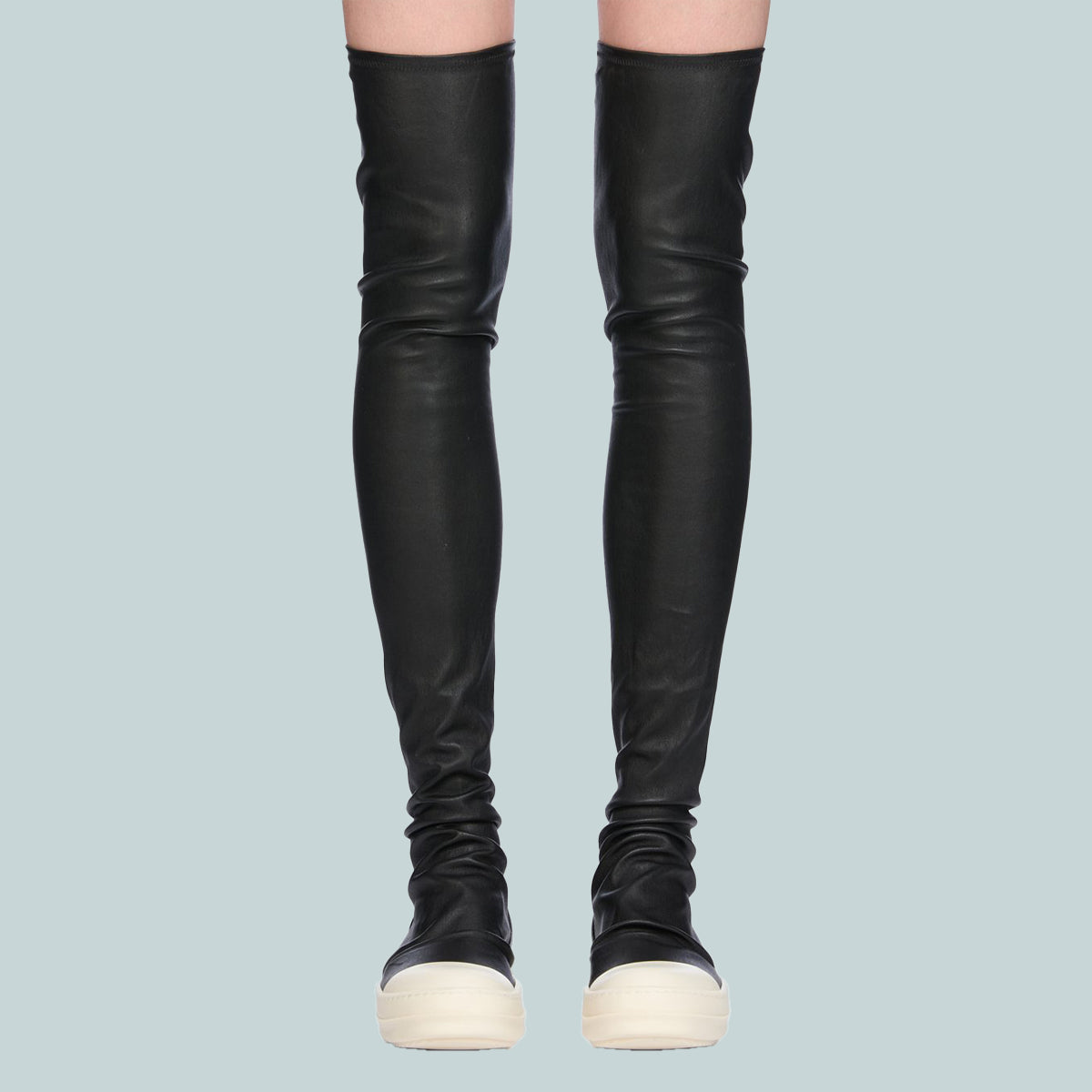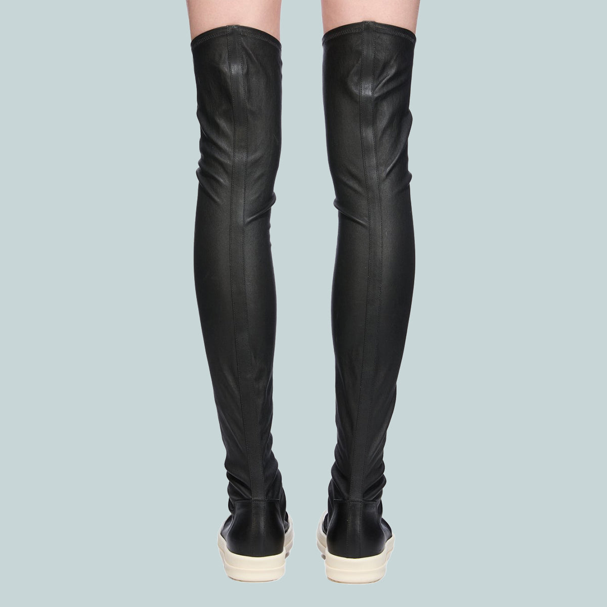 these knee high stocking sneaks are above knee height. they have stretch leather stocking uppers, draping around the upper foot and ankle, toe caps and shark-toothed bumper soles.