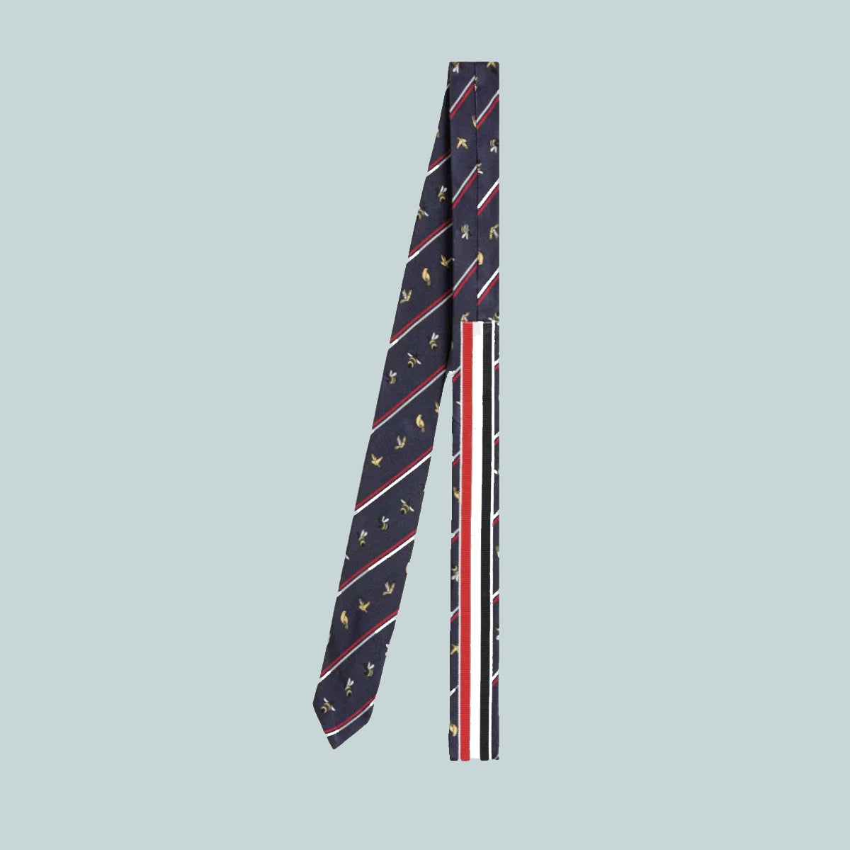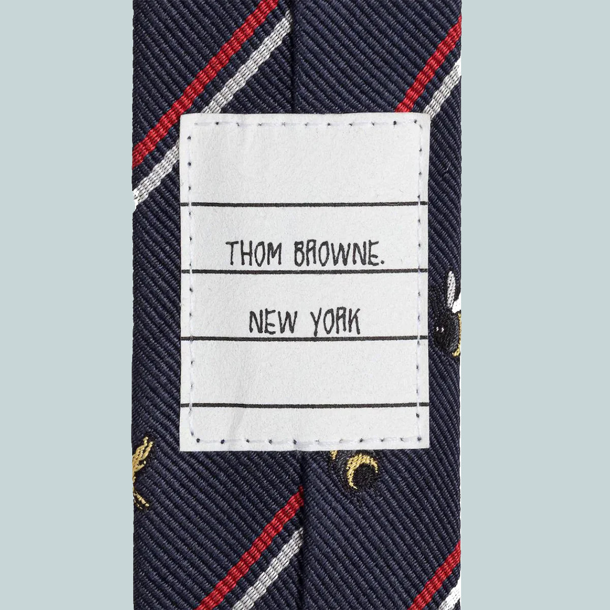Classic necktie in navy tie jacquard with diagonal stripe and bird and bee details throughout. Name tag and striped grosgrain appliques at reverse.