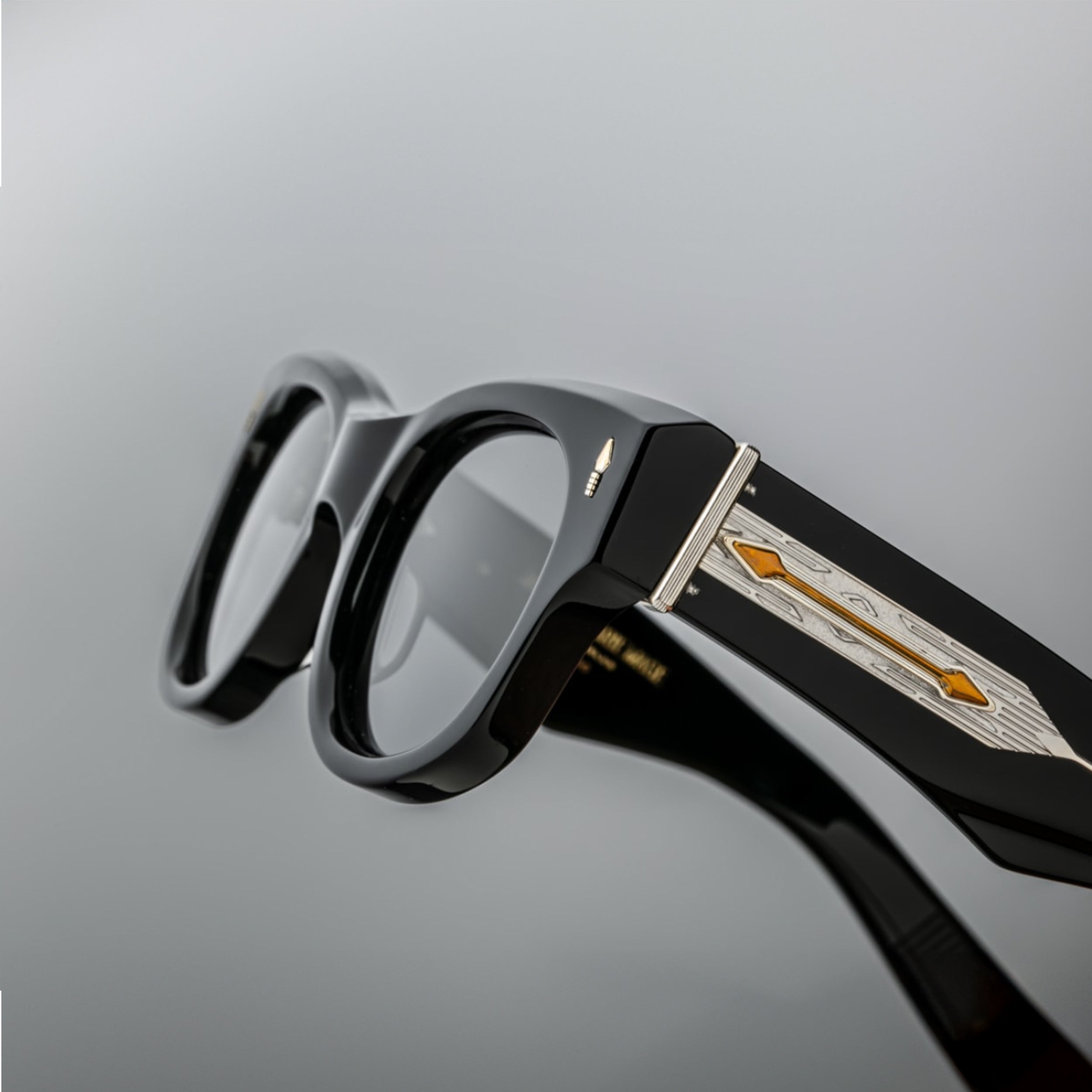 - Black 10mm cured cellulose acetate frame with custom double laminated acetate temples featuring precious metal hardware and grey lenses