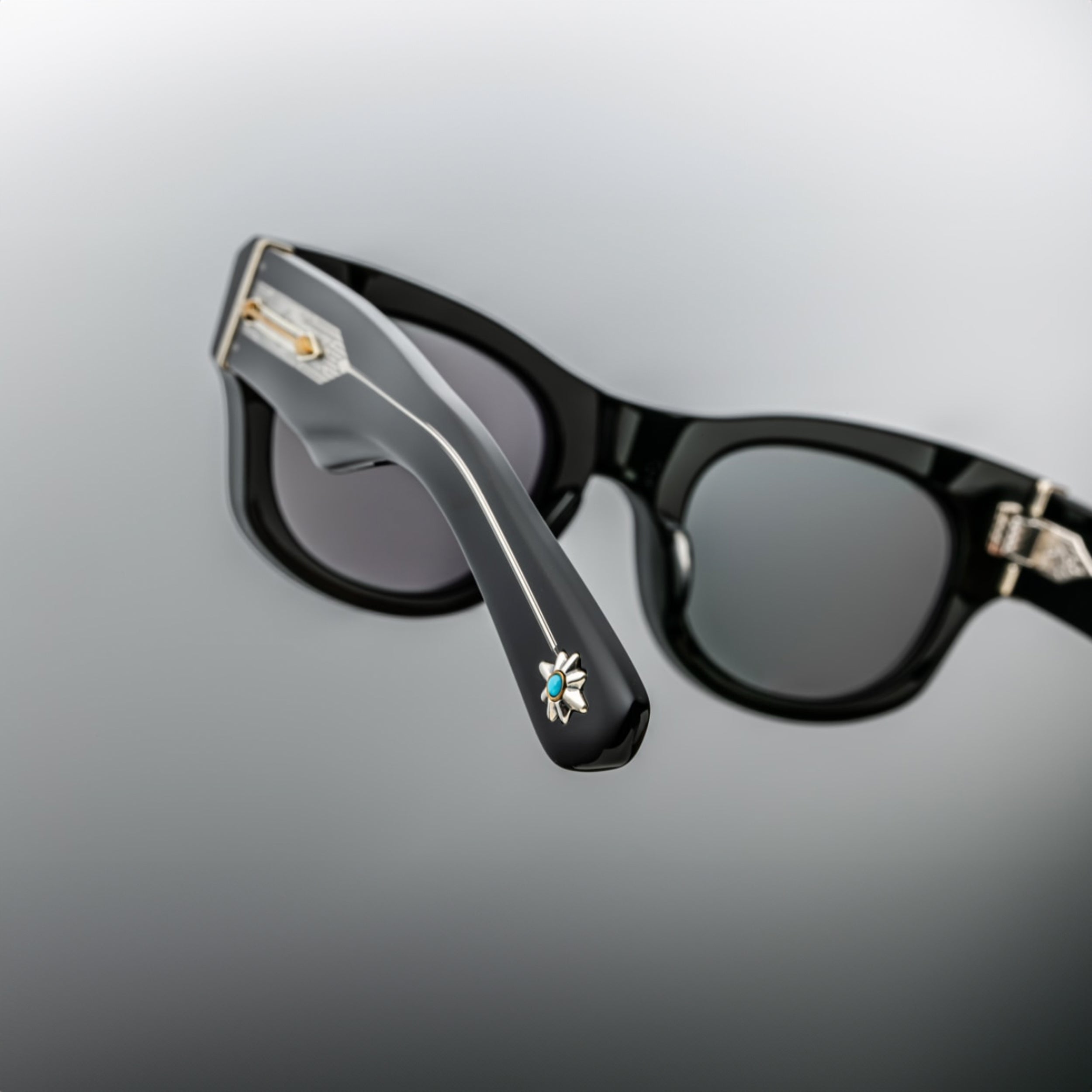 Late-‘50s-inspired glasses with subtle cat-eye and soft lens shape, featuring ornate double-arrowhead temple motif and “blue flower” cameo with turquoise inlay at the temple tip.