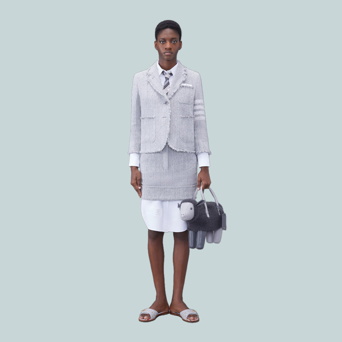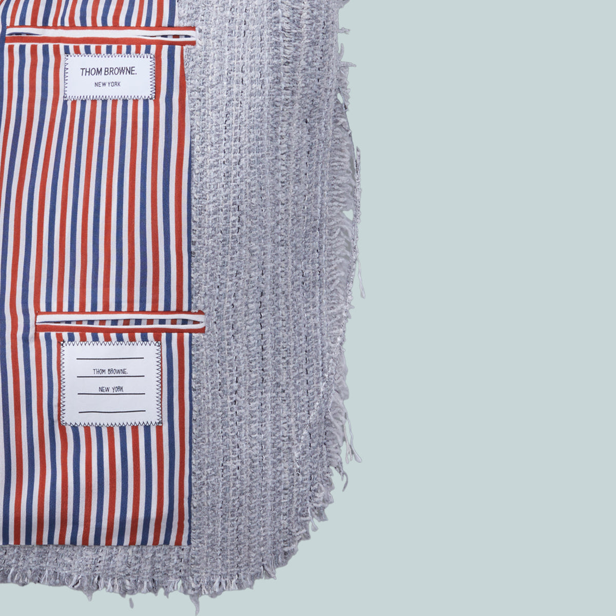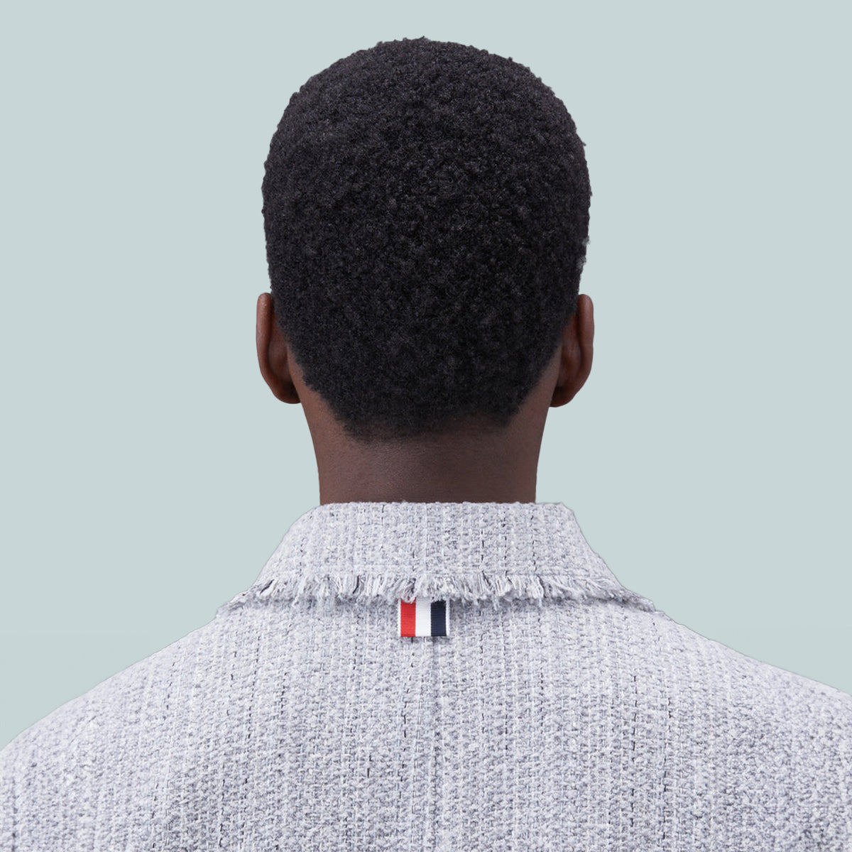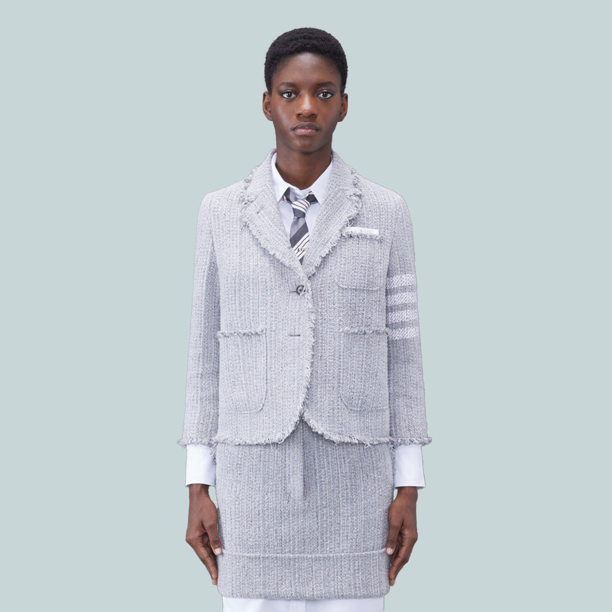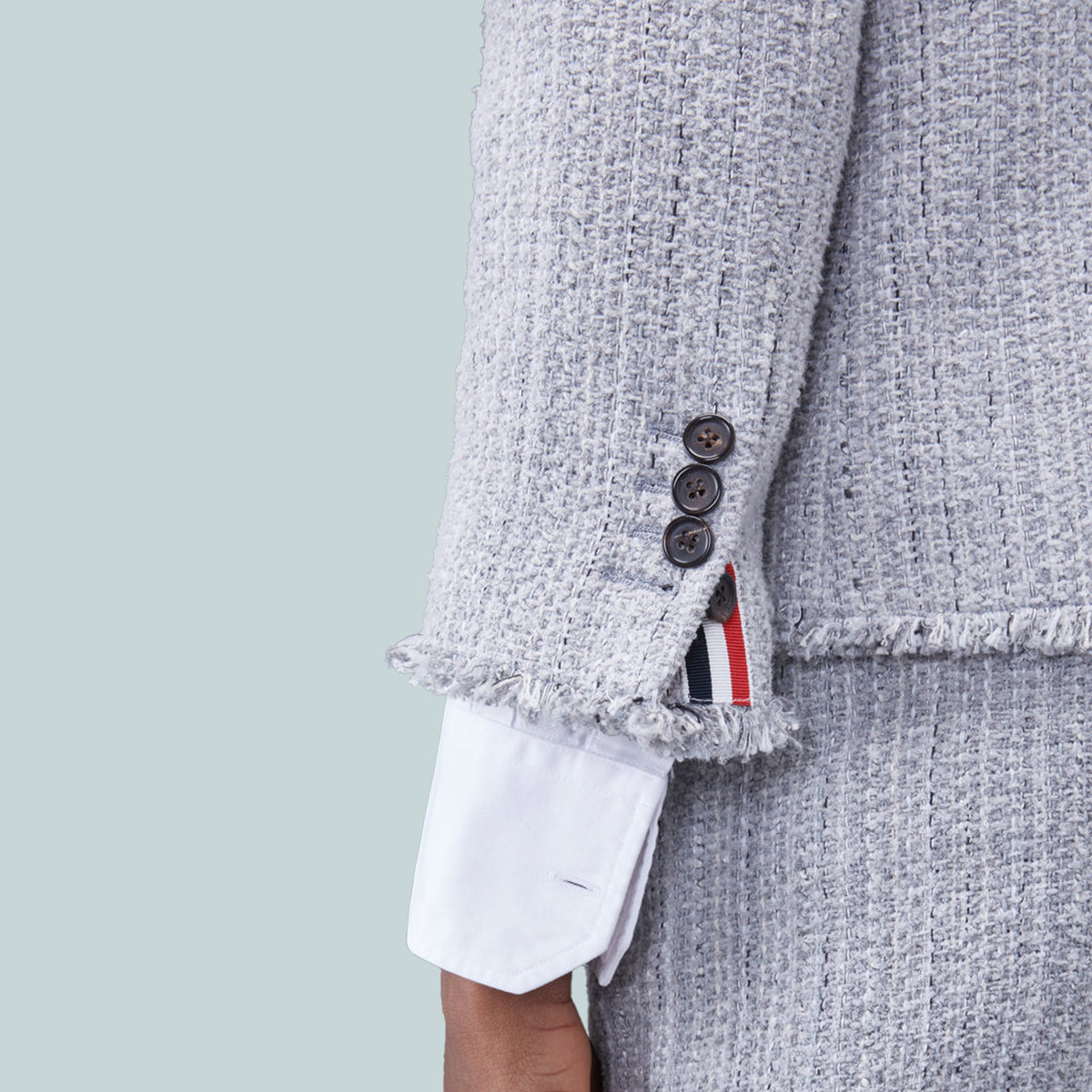 Impeccable craftsmanship, fine fabric, and distinctive Thom Browne emblems make this jacket an essential garment for your seasonal wardrobe. Pair it with any of our tweed trousers.