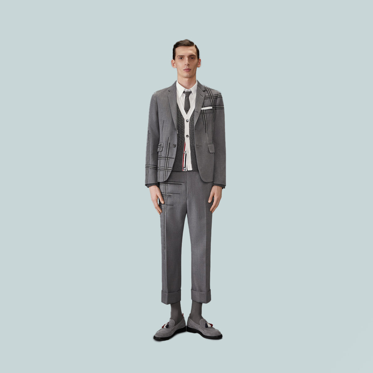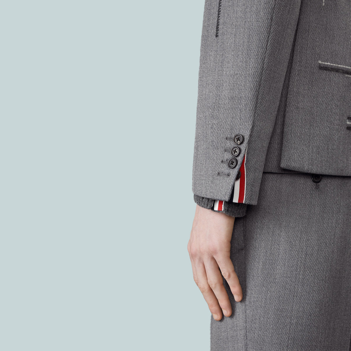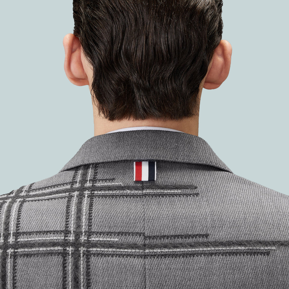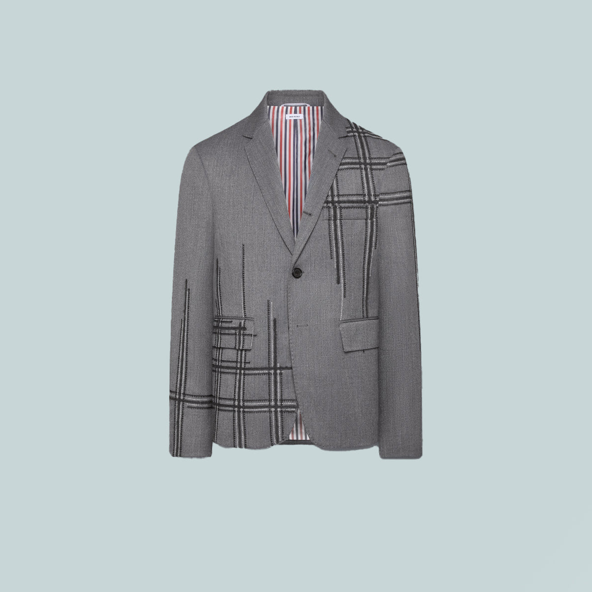 A symbol of individuality, this evocative sport coat is a collector’s essential. Our classic uniform silhouette is reimagined with intricate blanket and chain stitching, where incomplete boxes emerge, evoking both cages and the act of breaking free. More than a garment, it's a wearable story—a metaphor for shedding constraints and stepping into freedom. Heritage craftsmanship anchors every detail, from deliberate proportions to luxurious wool fabric. Made for those who write their own rules. Complete the suit with our Low Rise Wool School Uniform Trousers.