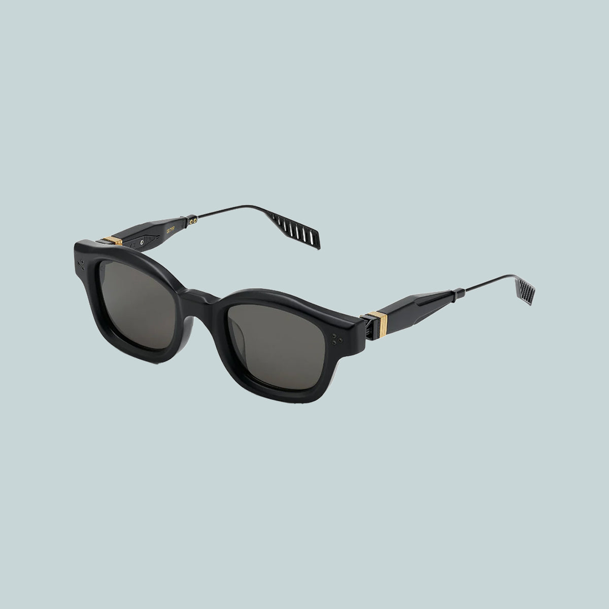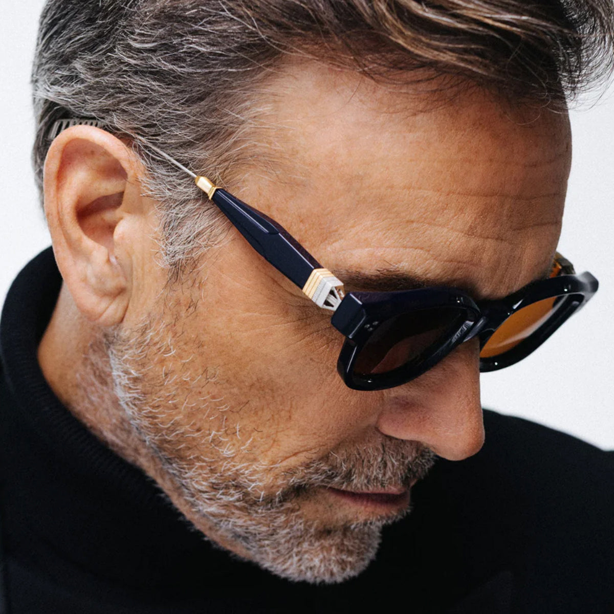 Combination construction, utilizing a cotton extrusion method with custom complex coloration construction featuring 10mm hand-carved fronts with hypoallergenic nose pads. Optics are outfitted with a six/base CR39 lens finished with both anti-reflective and scratch-resistant coatings. Monoblock decor connections with two-tone detail secured by custom torx screws.