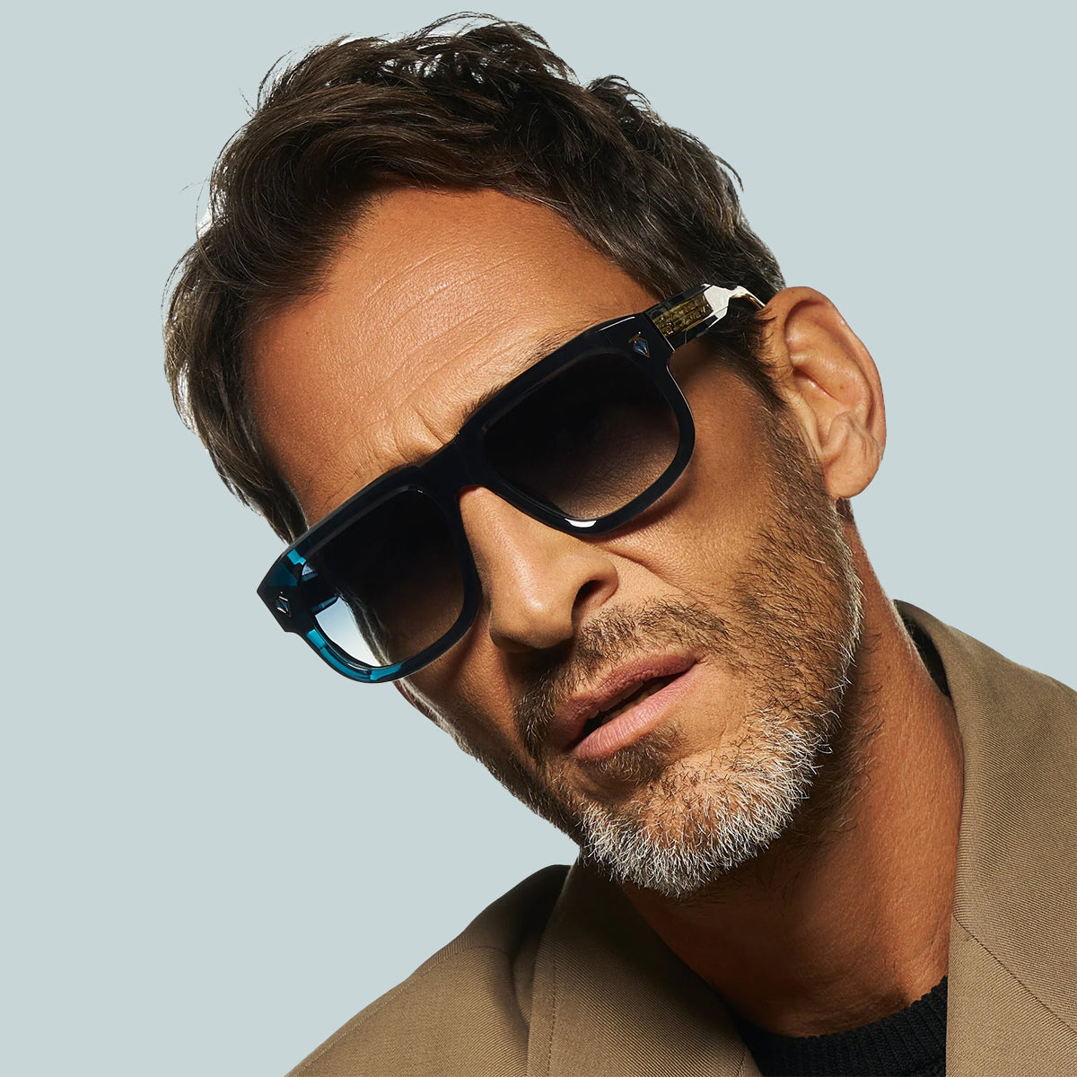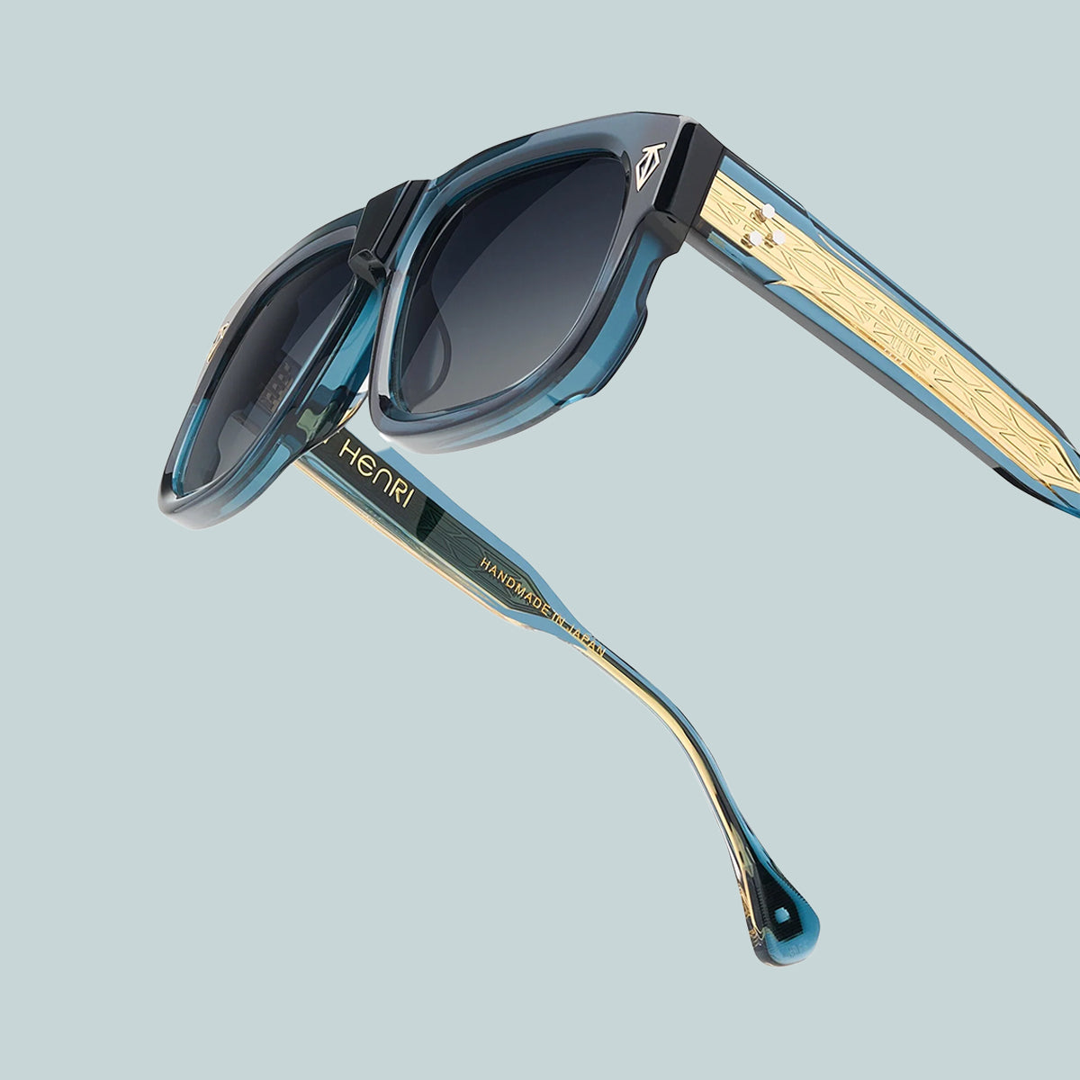 Sterling silver front decors with two-tone enamel detail. Voluminous 5mm temples with clear crystal lamination construction showcasing our intricate piston core-wire system. Powered by a German-engineered 7-barrel hinge