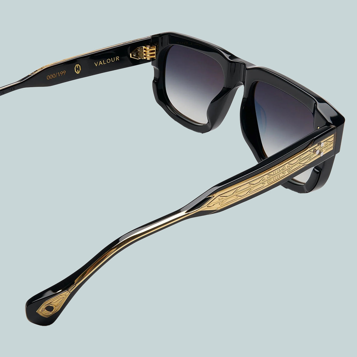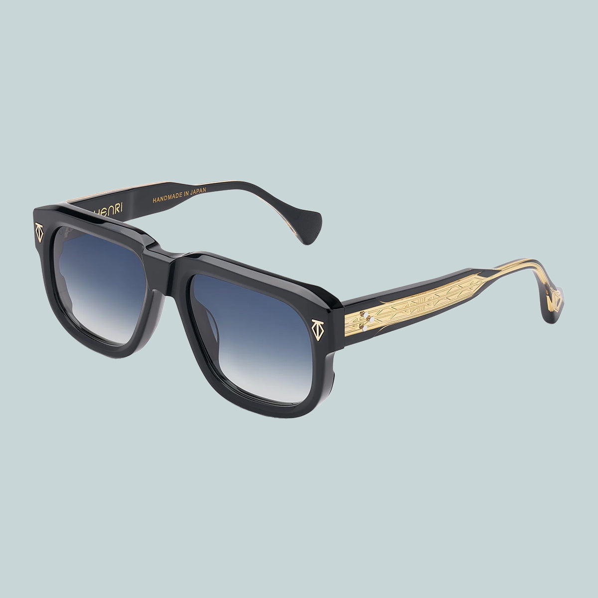 Sterling silver front decors with two-tone enamel detail. Voluminous 5mm temples with clear crystal lamination construction showcasing our intricate piston core-wire system. Powered by a German-engineered 7-barrel hinge