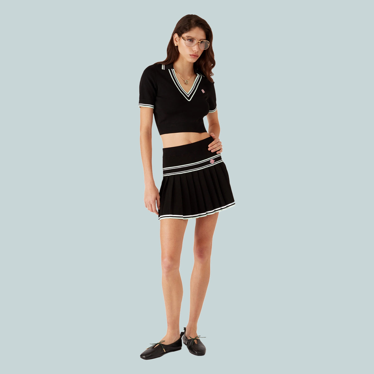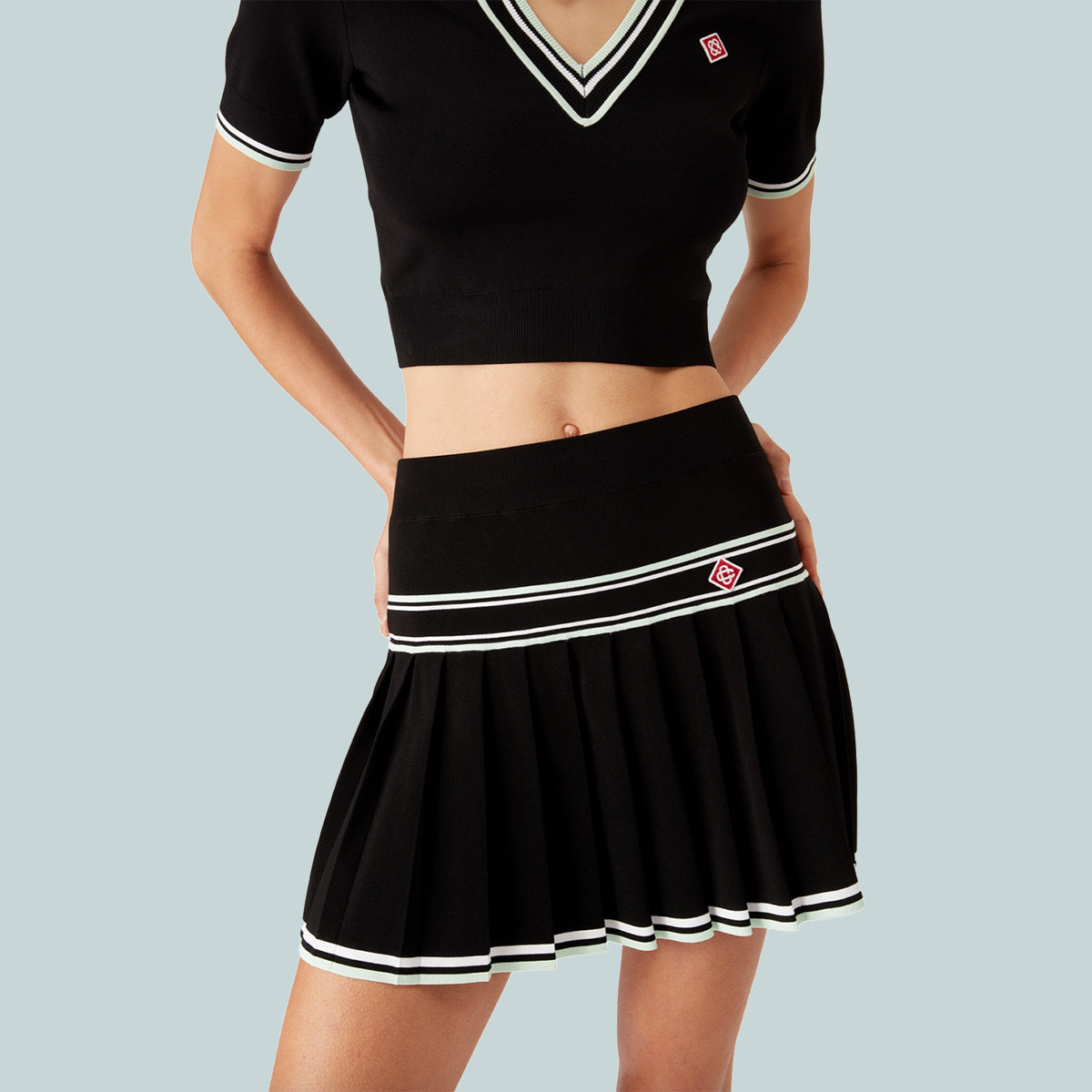 The viscose pleated mini skirt is a short design crafted from viscose fabric. Completed with a yoke featuring stripe detail, a pleated panel with horizontal stripe hem detail.