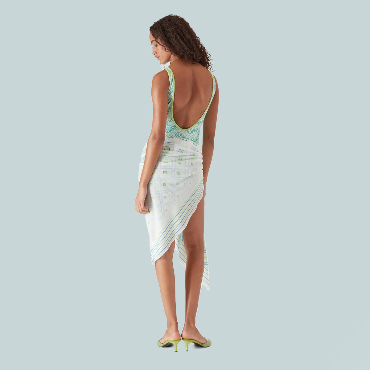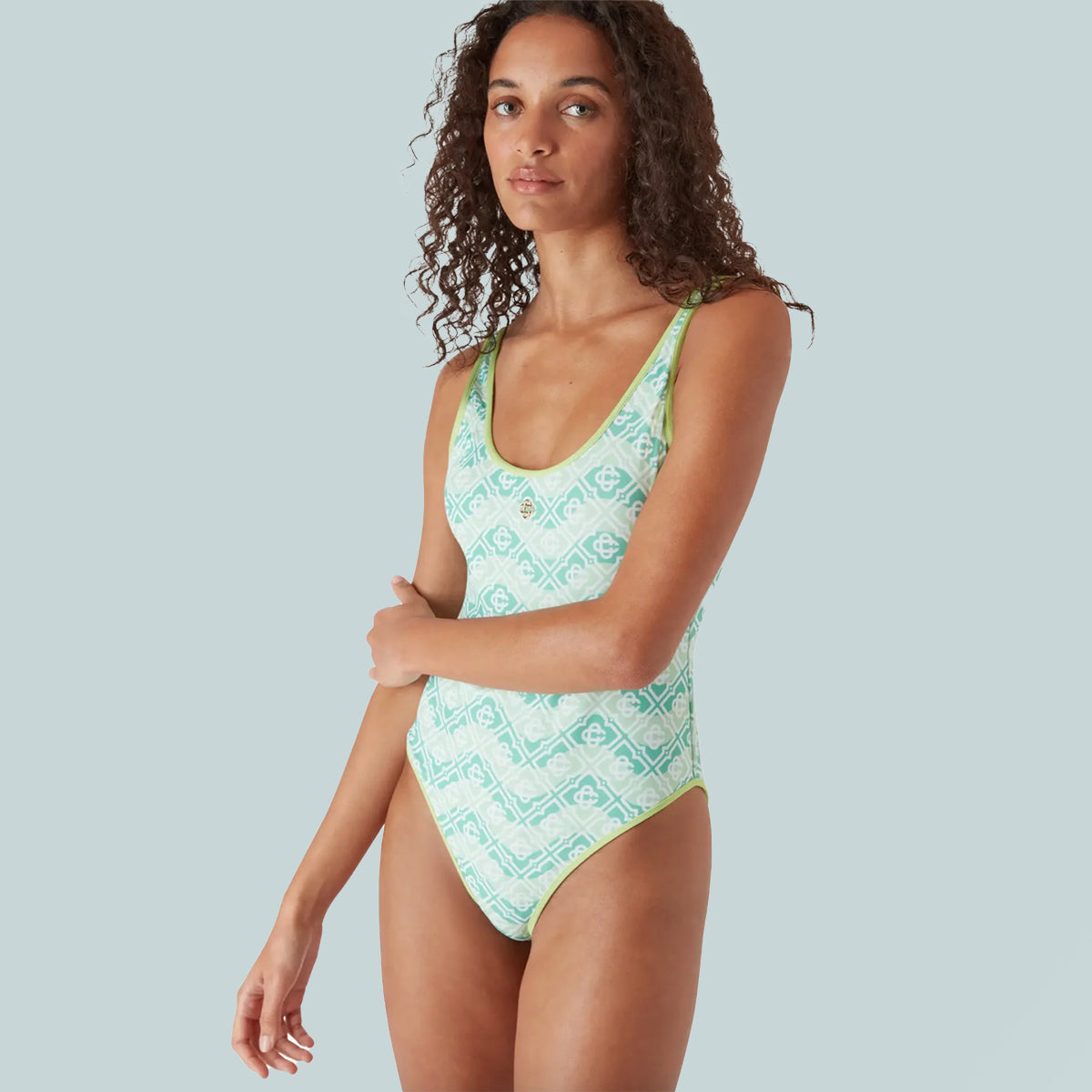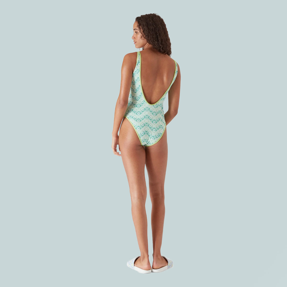The Wavy Monogram printed swimsuit is a refined design featuring the house's monogram pattern on a Memphis-wave inspired background. Completed with the house's signature diamond logo on the chest, high-cut legs, a scoop neck, a deep scoop back, and contrast edge detail.