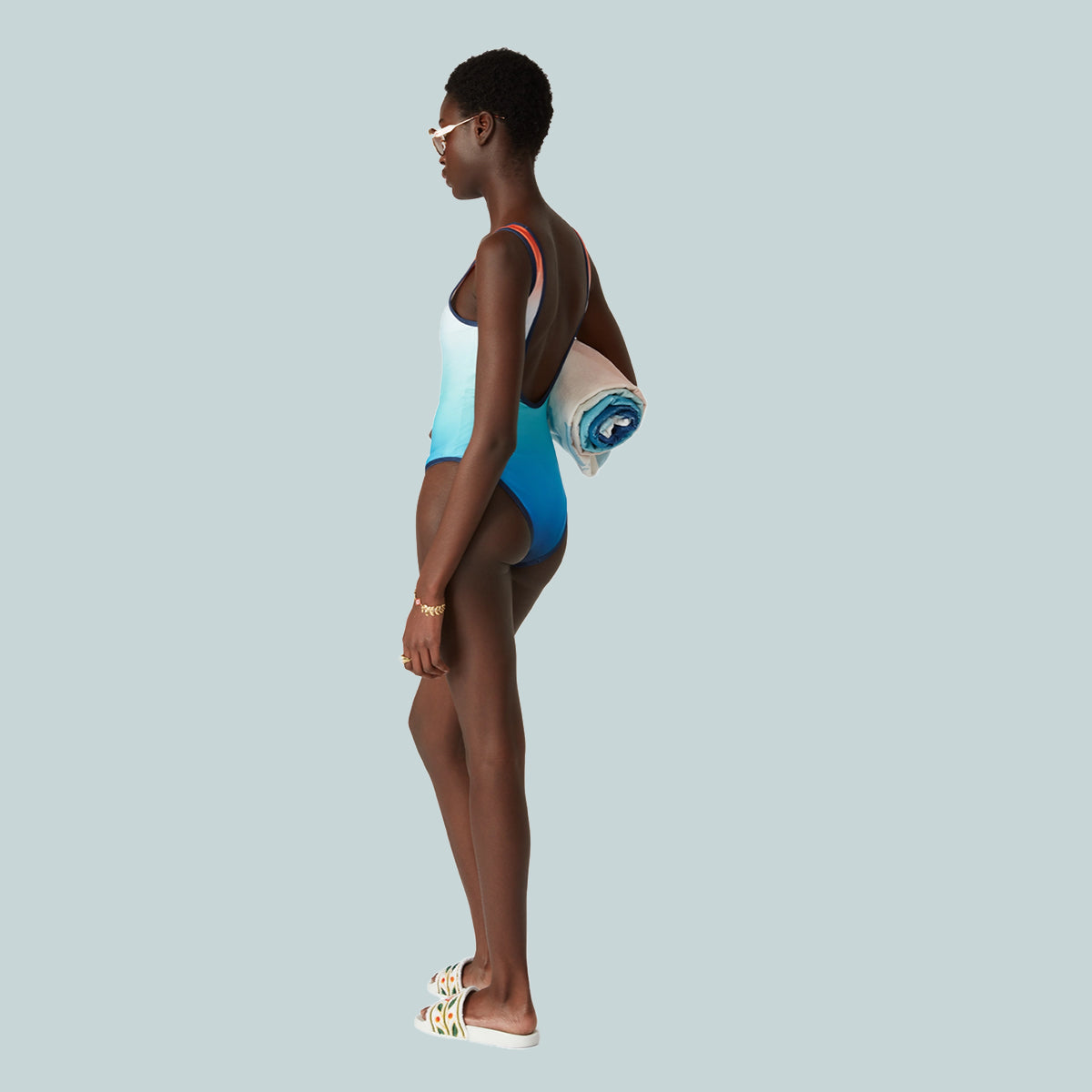 The gradient swimsuit is a printed design crafted from a breathable technical fabric, featuring a restrained palette of blue, aqua, white and orange in a colour gradient created especially for the collection crafted from a technical fabric. Completed with navy trims, high-cut legs, a scoop neck, and a low-cut back - this piece features the house's signature interlocking CC rivet on the chest.
