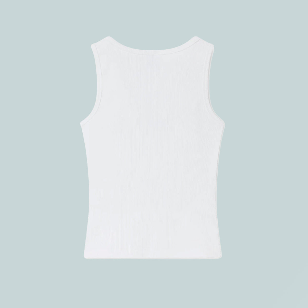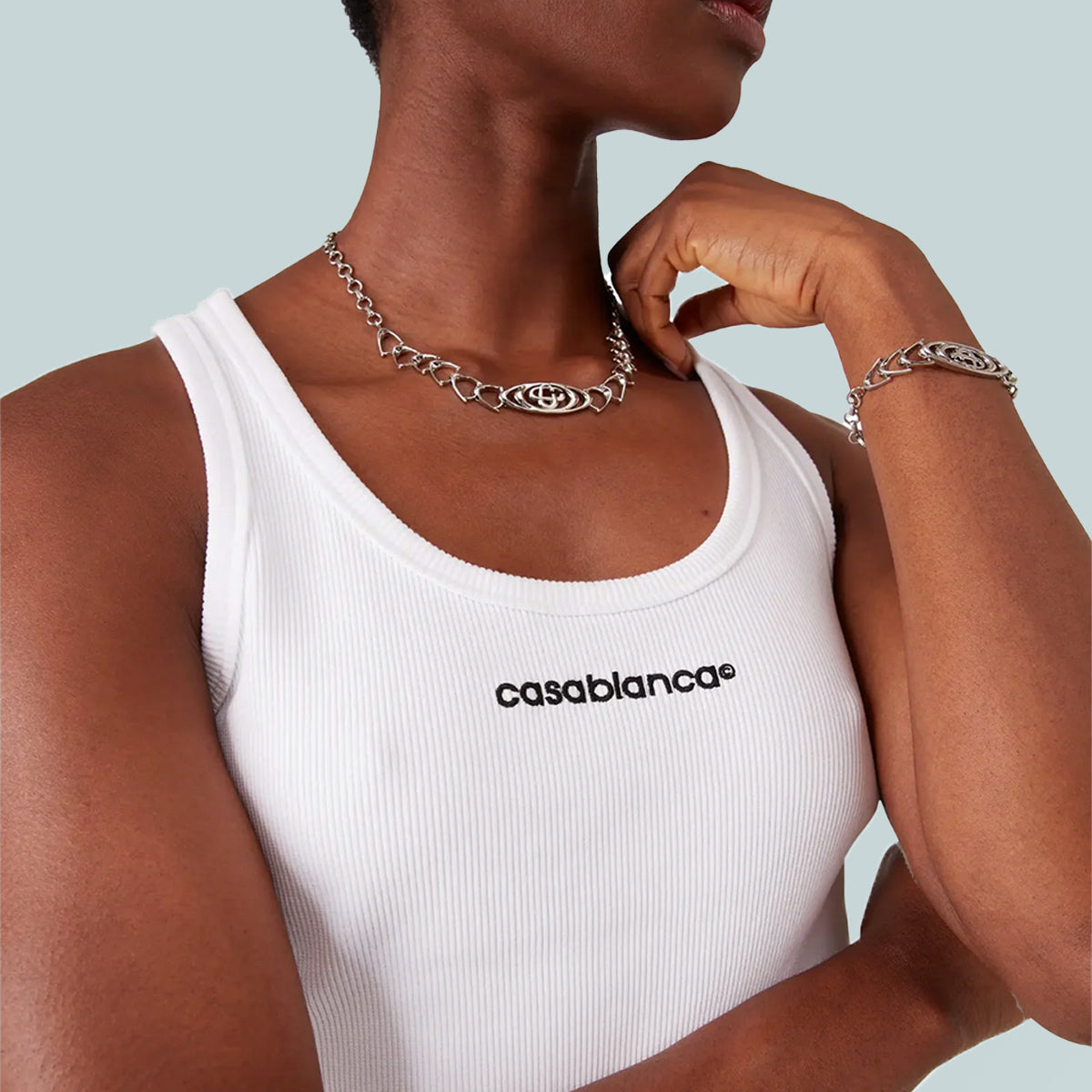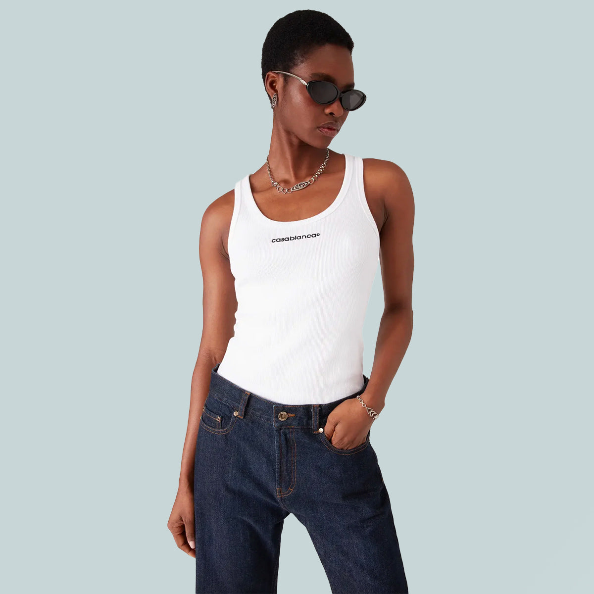 The ribbed tank top is a sleeveless design featuring textured rib construction, reflecting understated sport-leisure codes. Completed with the Casablanca logo, a scoop neck, and ribbed detail edges around the neck and armholes.