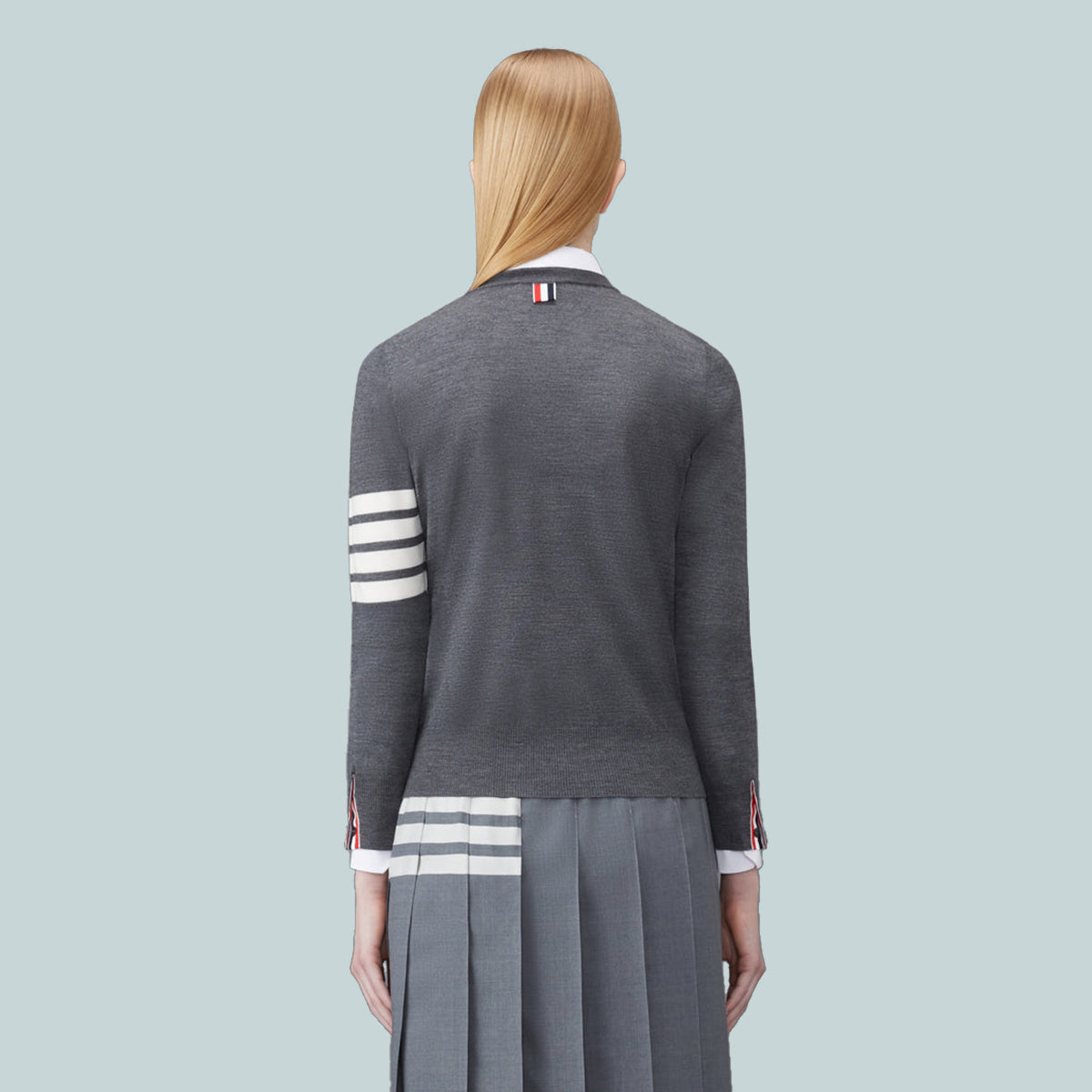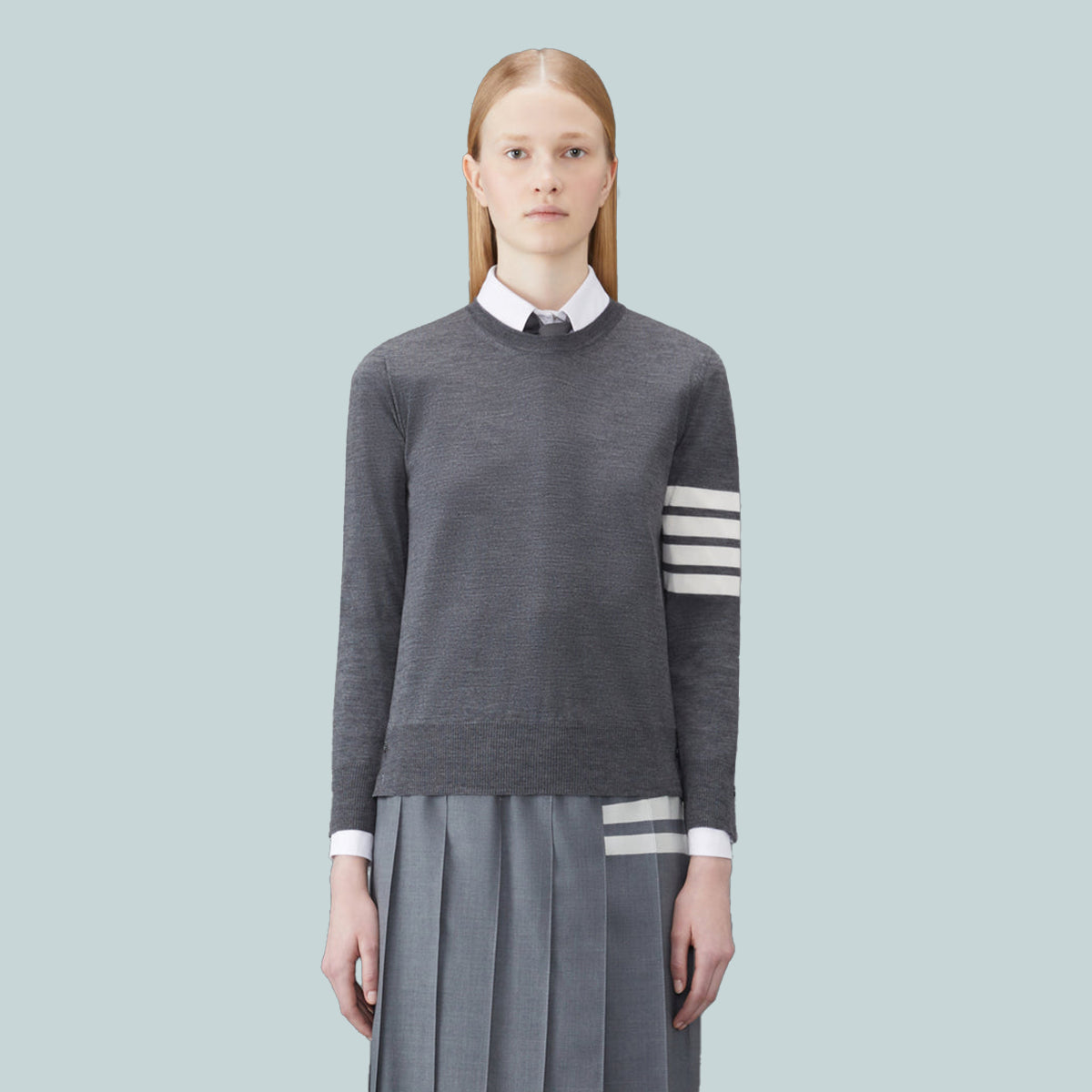 A signature Thom Browne emblem defines our Wool 4-Bar Relaxed Pullover. Inspired by varsity stripes, our 4-Bar design is Thom Browne most sought-after icon. Crafted with fine merino fabric, this comfortable pullover will stand the test of time.