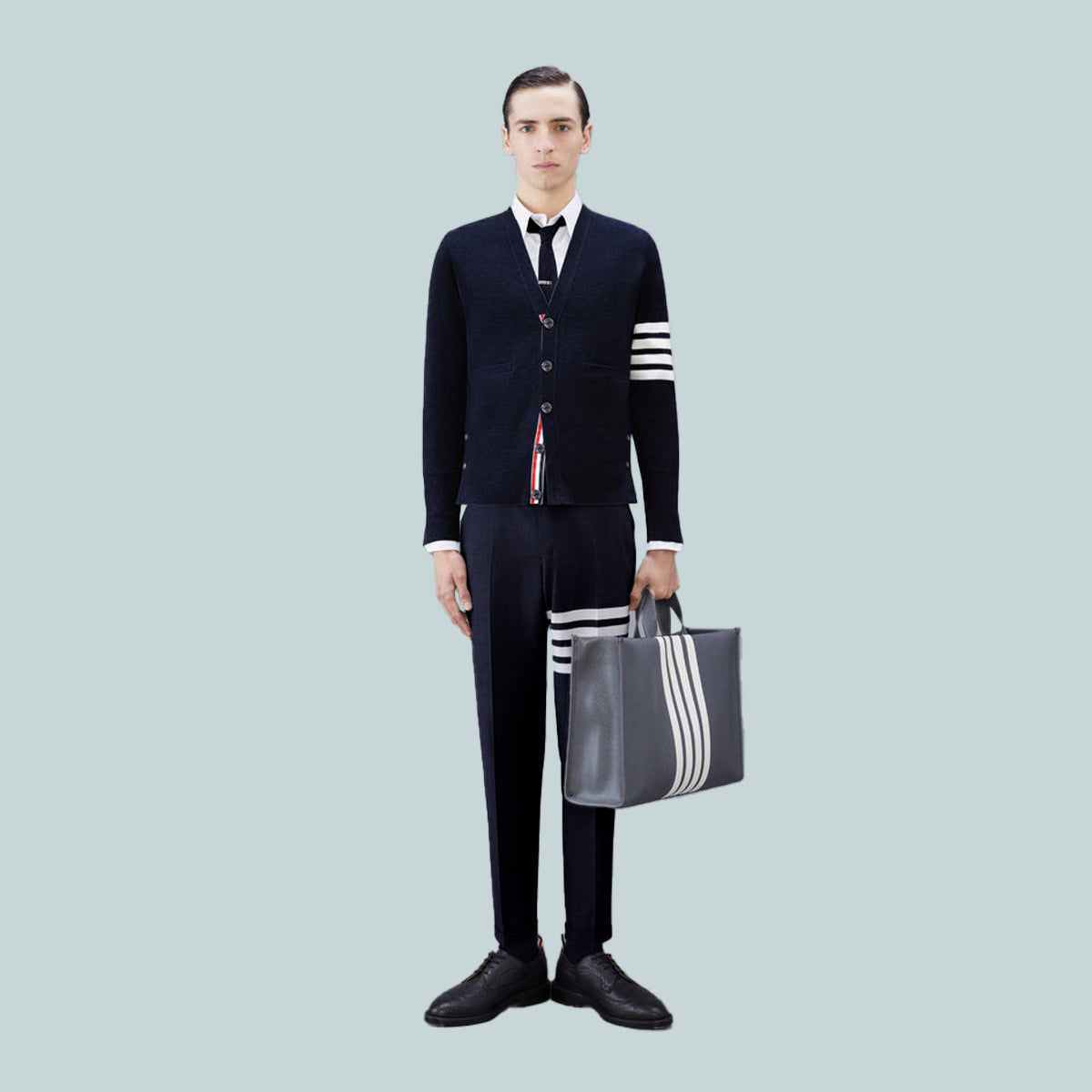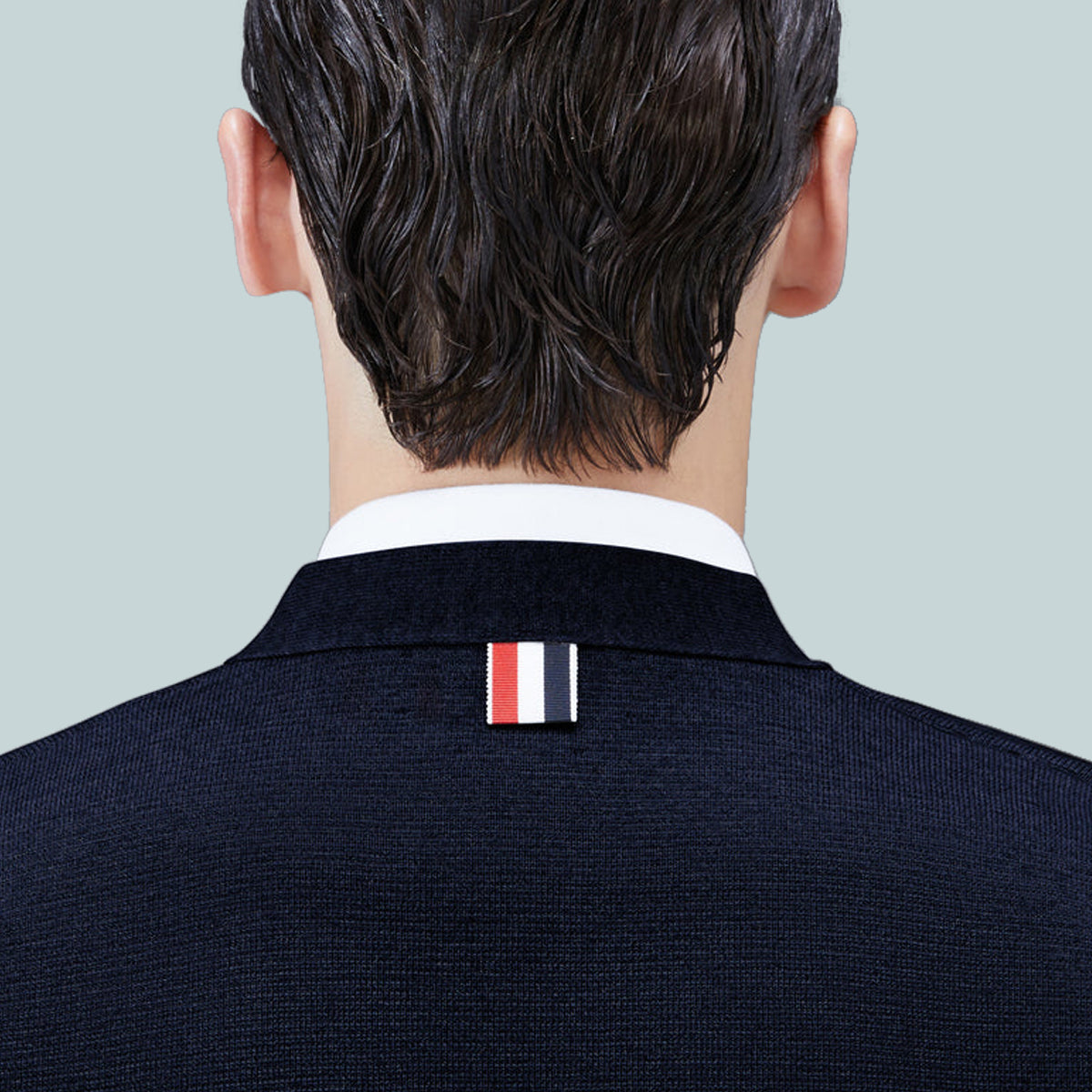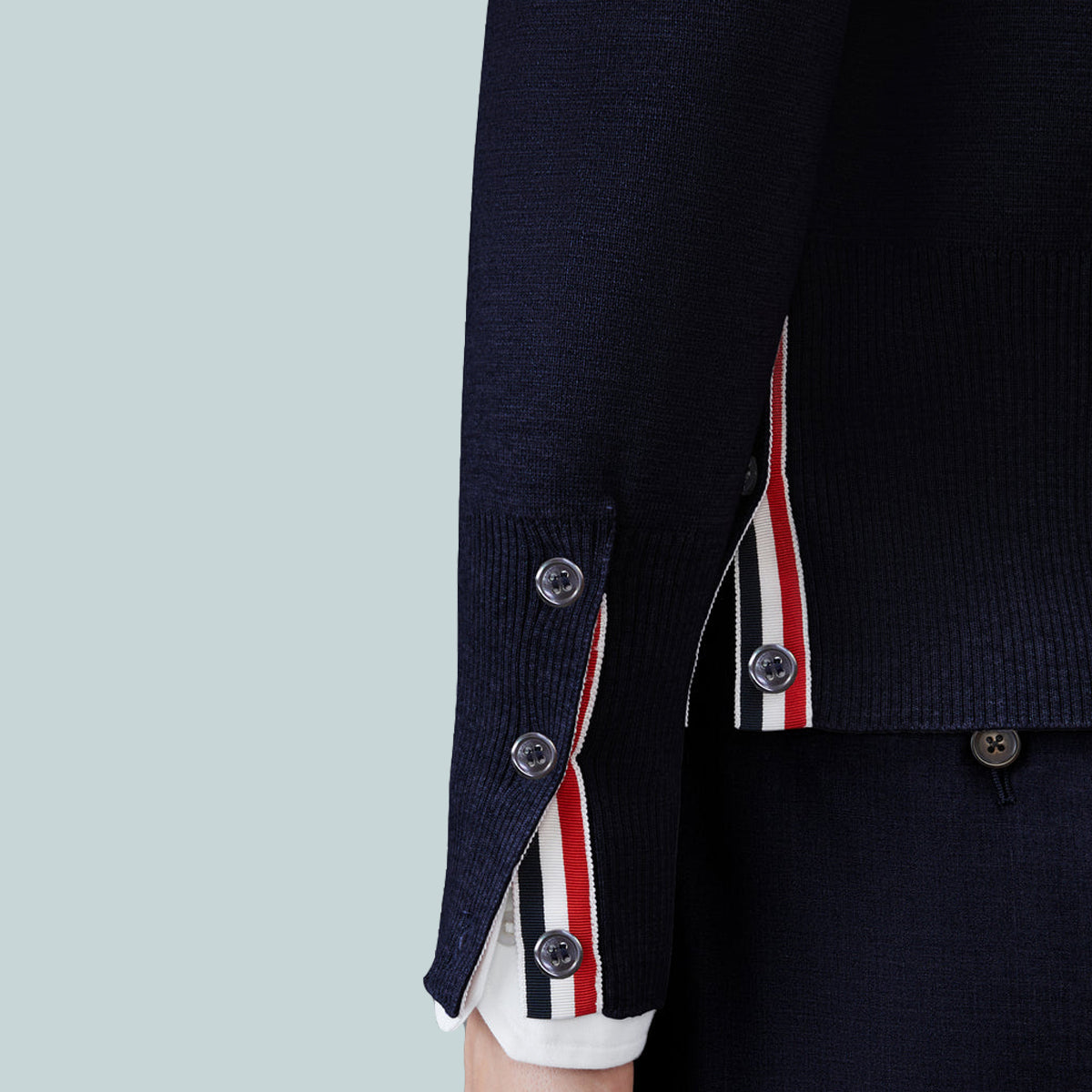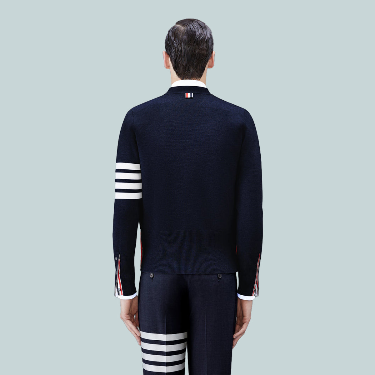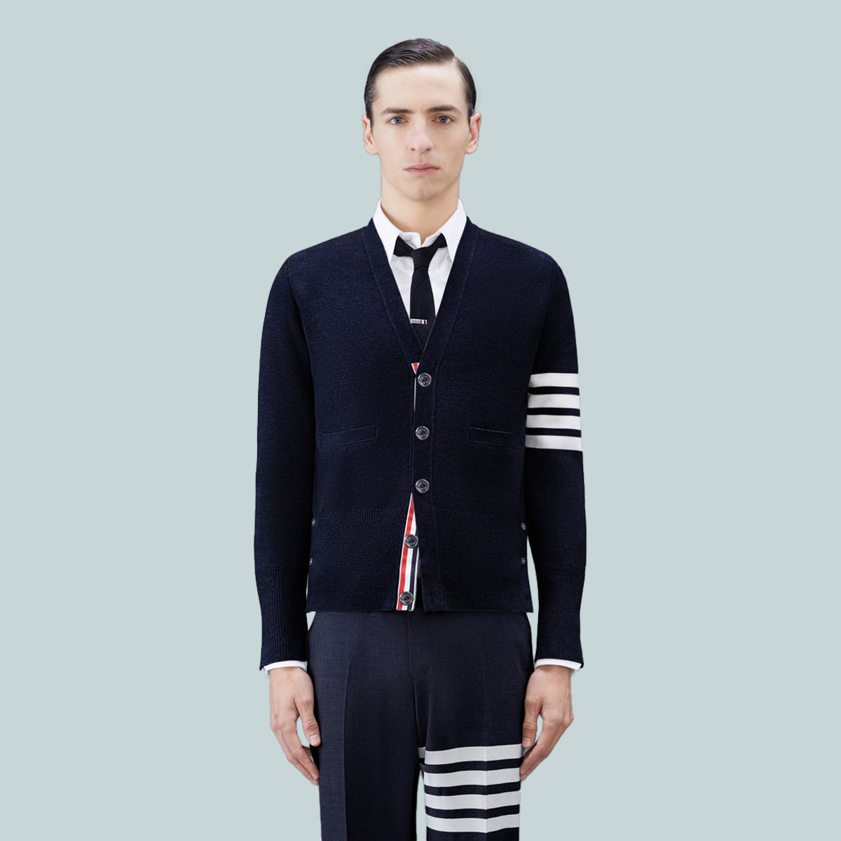 A Thom Browne emblem defines our Wool Classic V-neck Cardigan. 4-Bar stripes. Presented in fine merino wool fabric, this cardigan is a classic that stands the test of time.