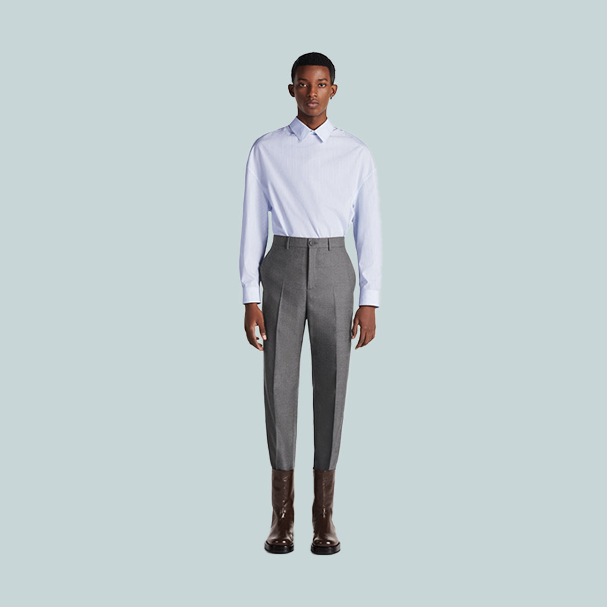 The pants pay homage to the art of tailoring. Crafted in gray virgin wool, they present a regular cut enhanced by a crease along the front of the leg. They feature two side welt pockets, as well as two rear piped pockets and a couture-inspired vertical side piped pocket. The classic pants can be coordinated with a jacket and shirt to complete a refined look.
