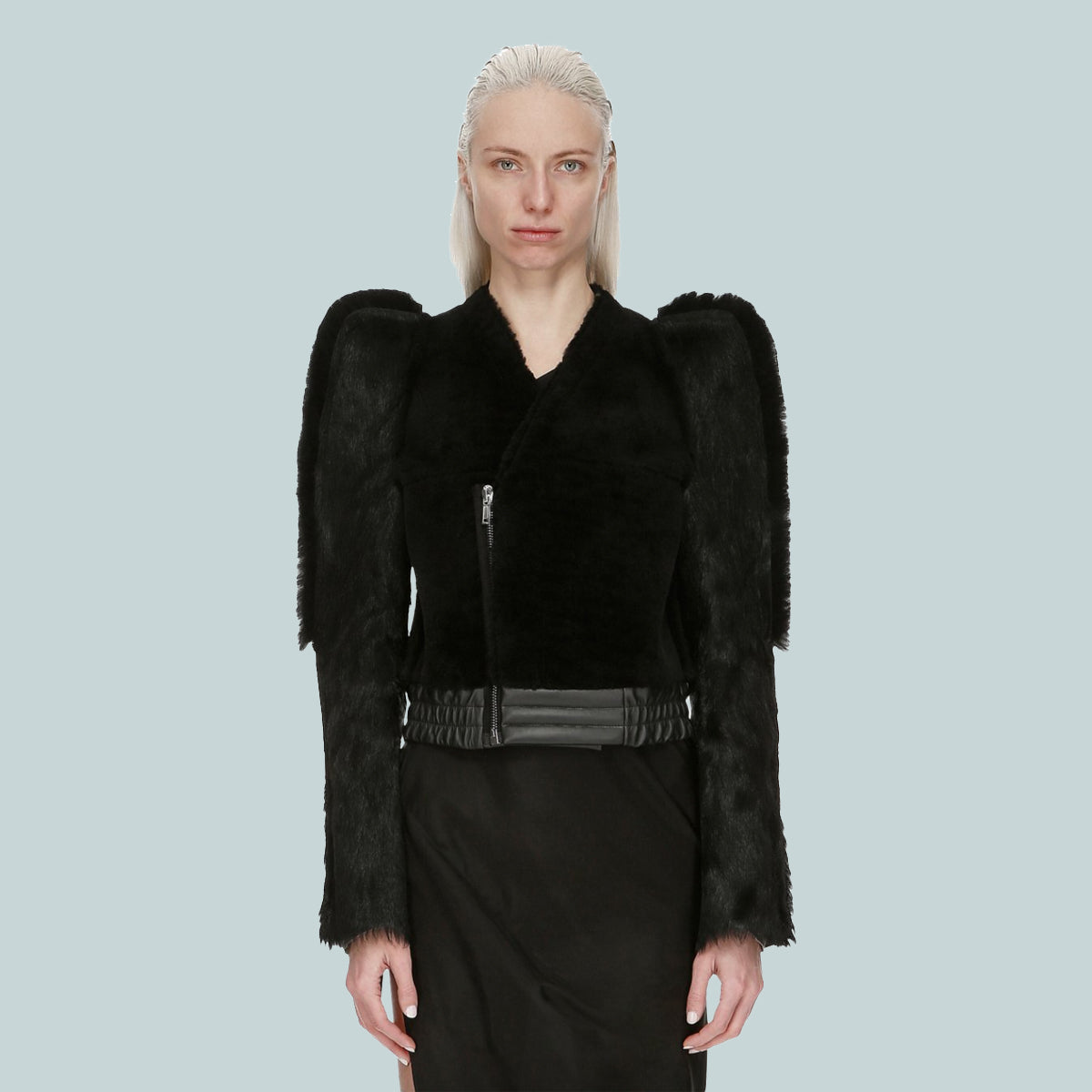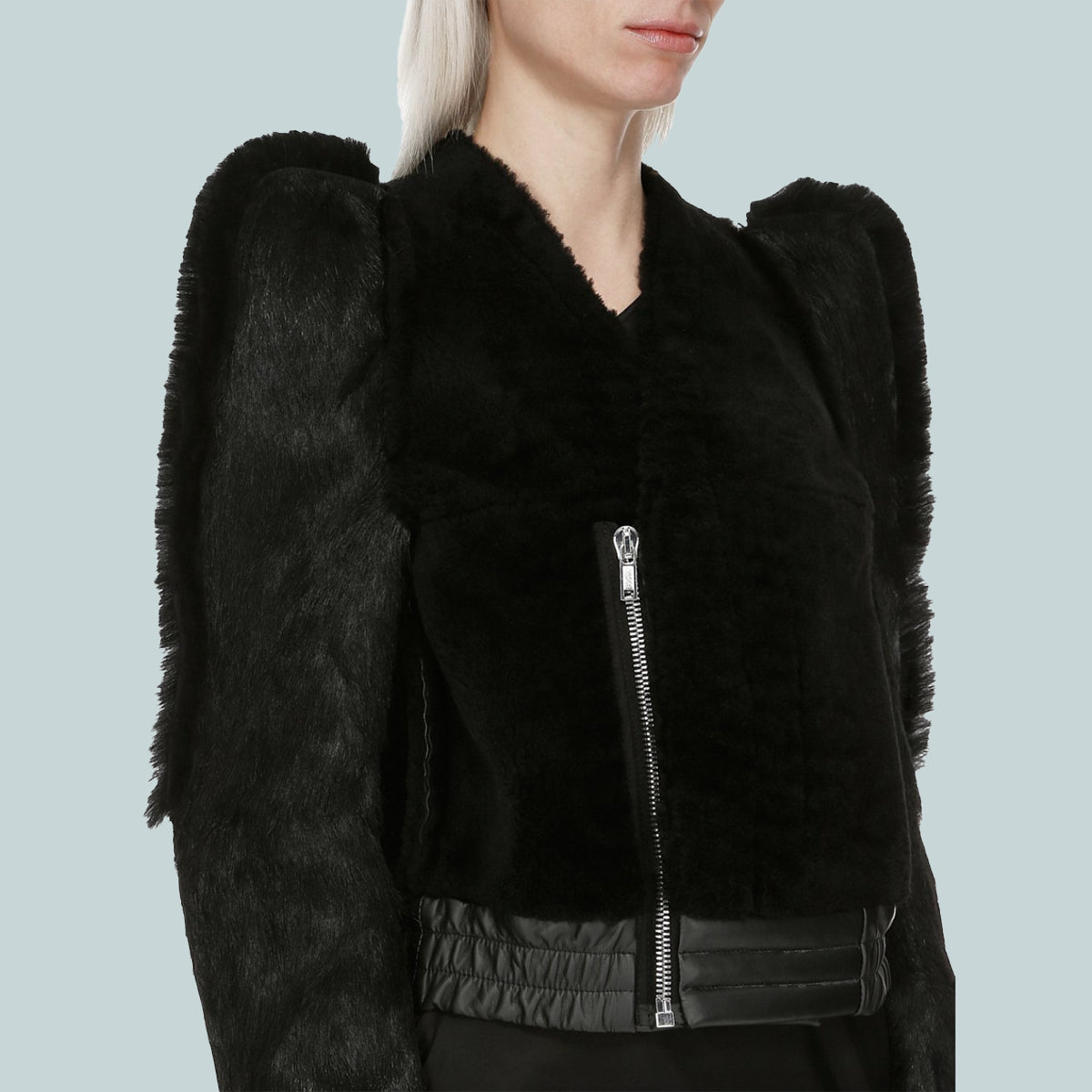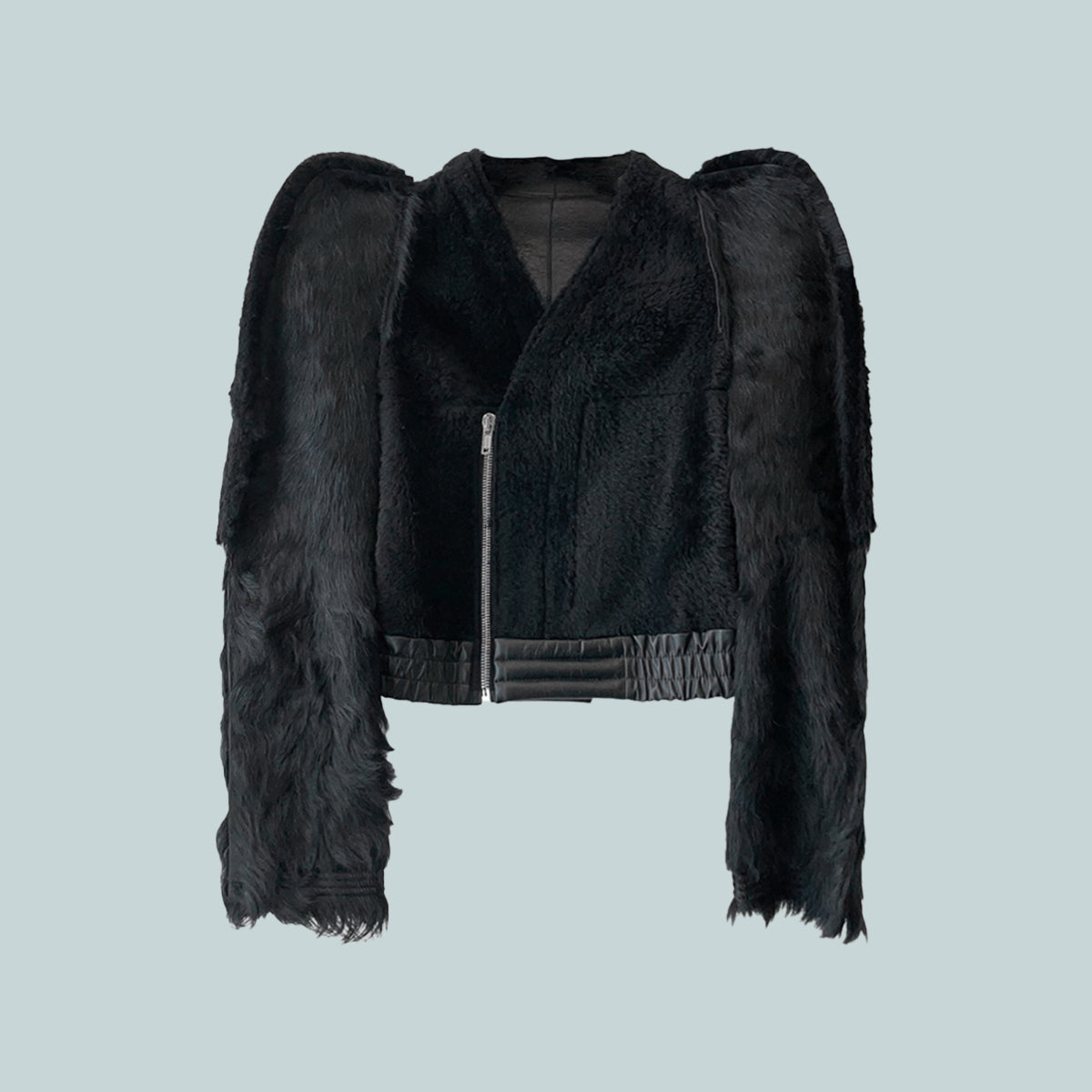 Rick Owens FW23 LUXOR zionic flanged bomber in black butter lamb shearling, long hair pony and goat fur.