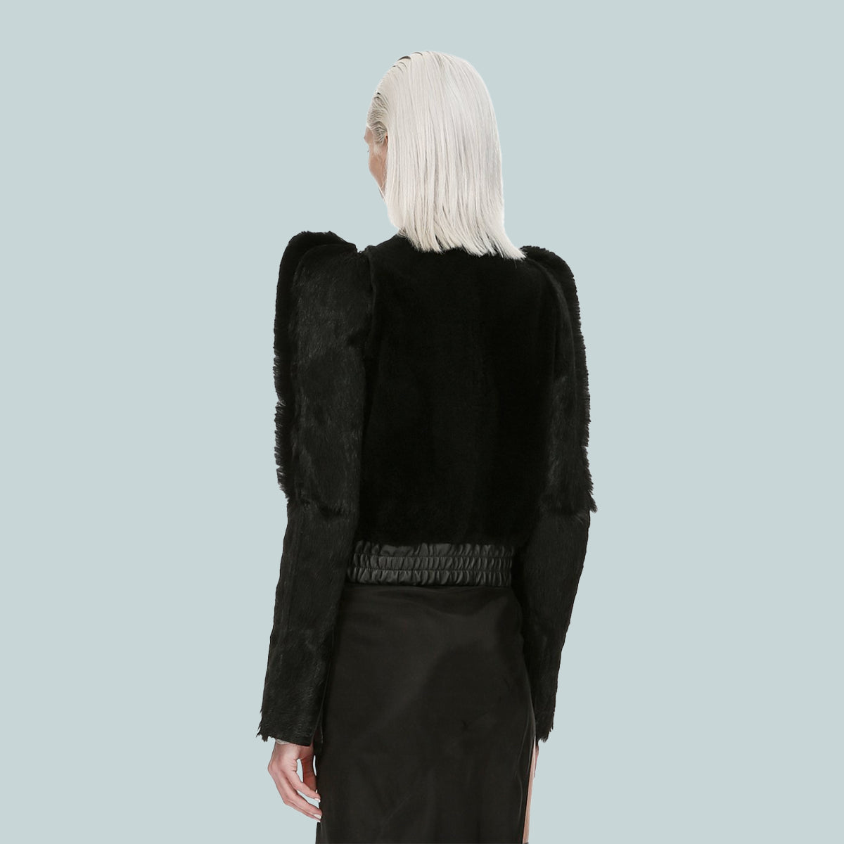 This zionic flanged bomber is below waist length with an off centre zipper and a slight v neck. it has rounded zionic shoulders with a flanged insert of long hair pony, long slim sleeves with slit cuffs and a ruched leather waistband. It is fully lined and has two internal pockets with snaps.