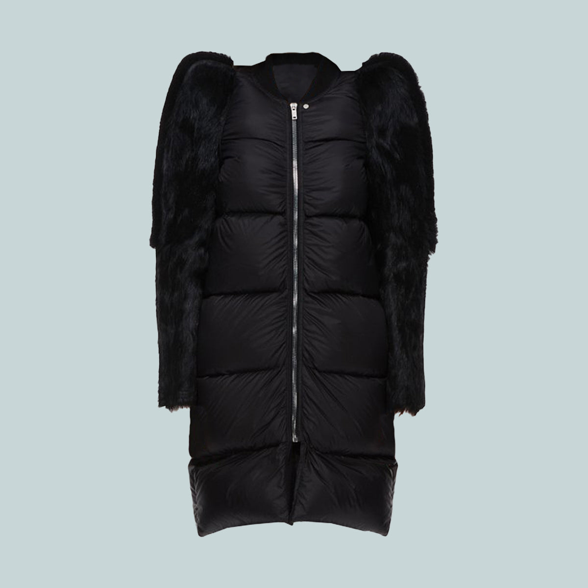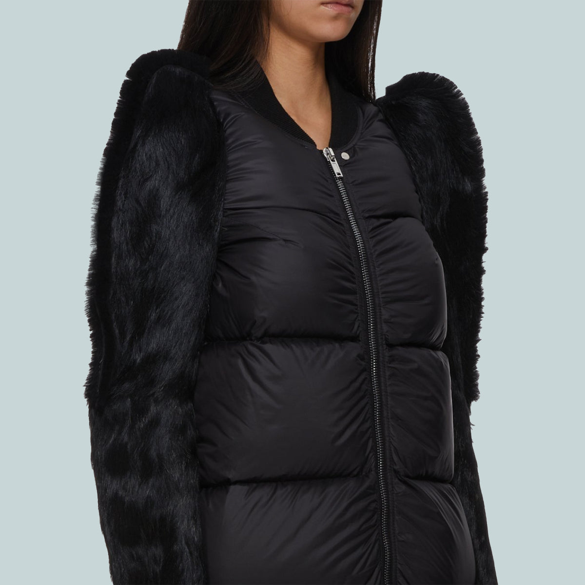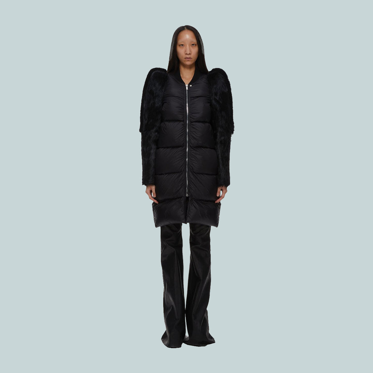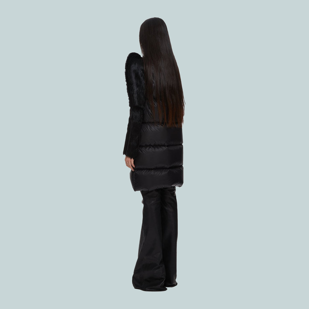 Rick Owens FW23 LUXOR zionic flanged pea in black recycled nylon, long hair pony and goat fur.